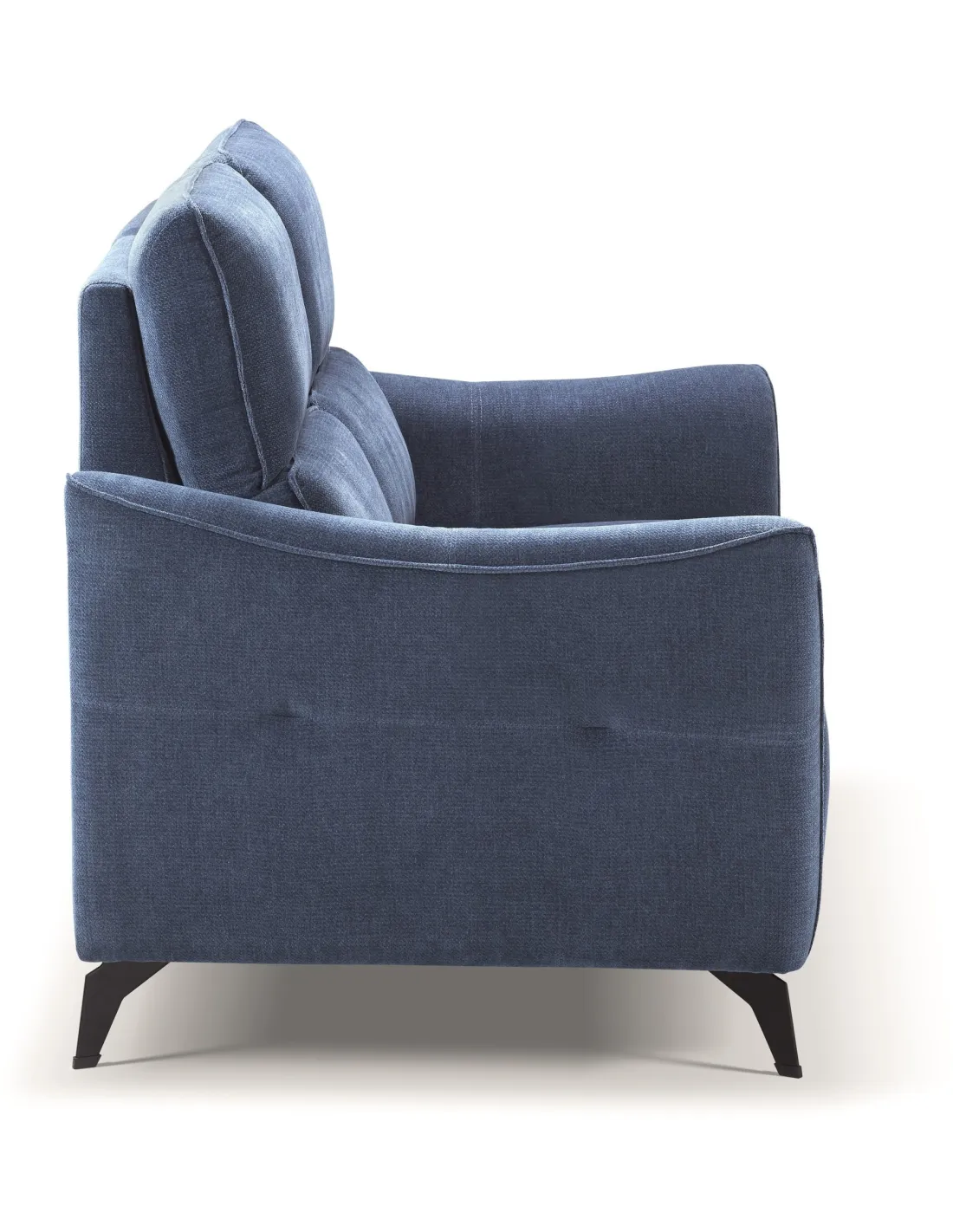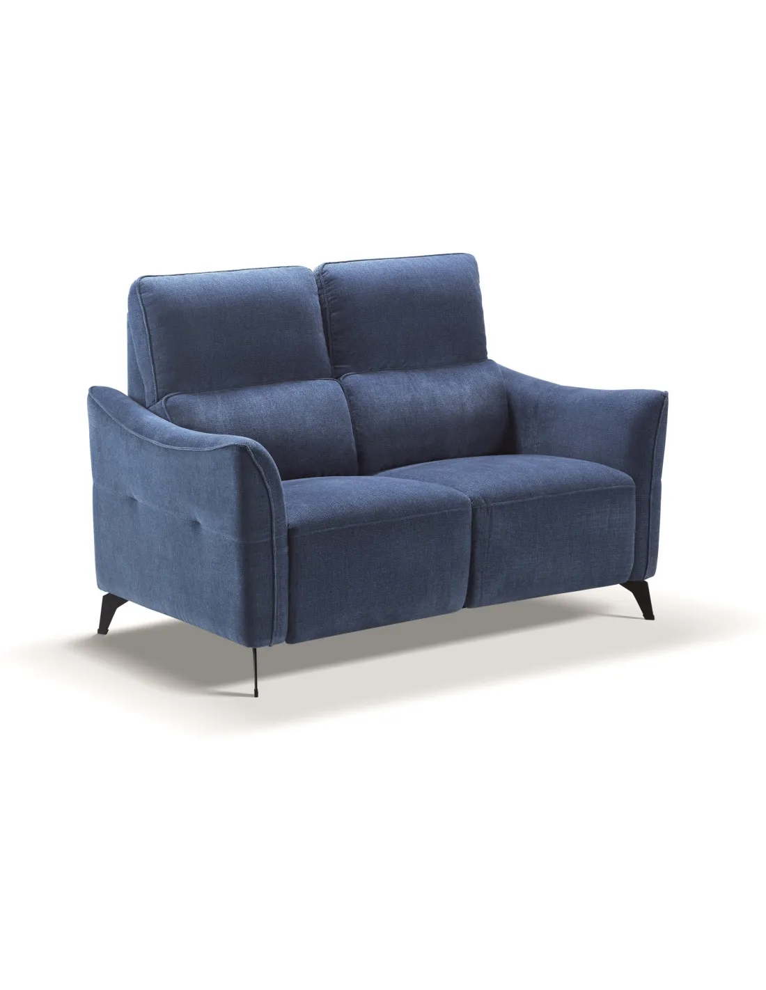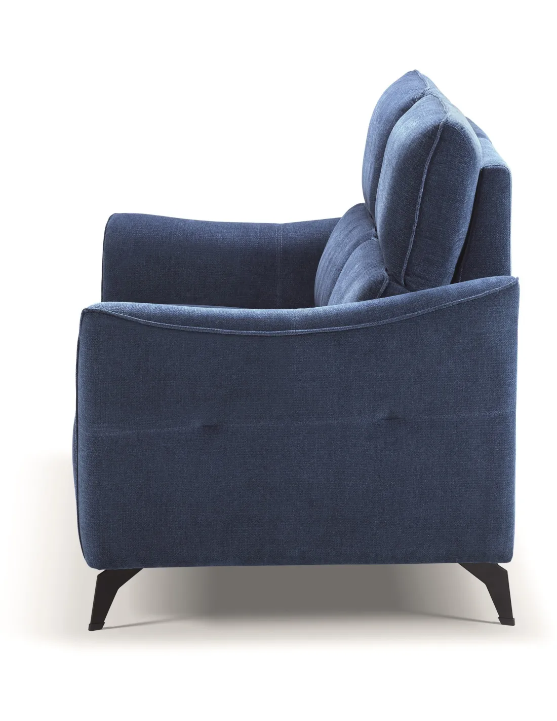 Canapé 2 places bleu au design contemporain. Tissu waterproof facile d’entretien, structure bois massif, suspension ressorts métalliques et pieds métal hauts.