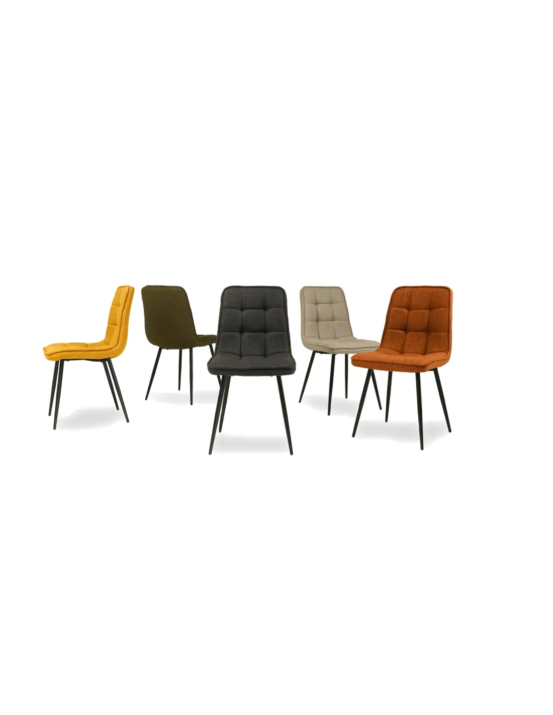 Son revêtement tissu et son piétement métallique composent une silhouette stable, raffinée et contemporaine.