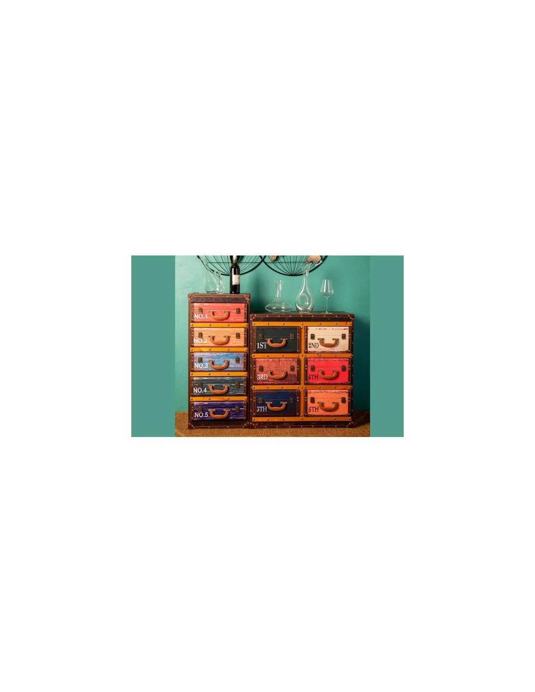 • Chiffonnier 5 tiroirs façon valises• Look vintage, style voyage• Finition bois patiné effet cuir• Idéal en meuble d’entrée ou chambre