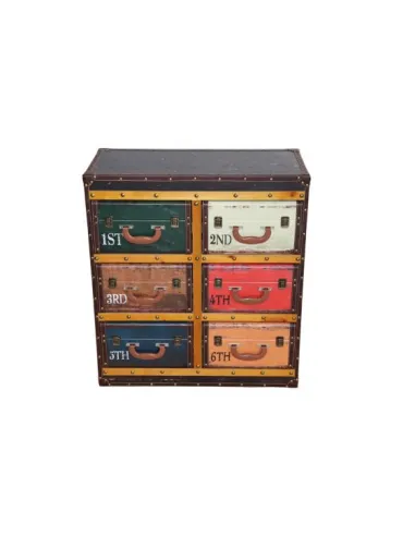 • Commode 5 tiroirs façon valises.• Design vintage esprit voyage.• Finition bois patiné effet cuir.• Compact, idéal pour une chambre ou un salon.