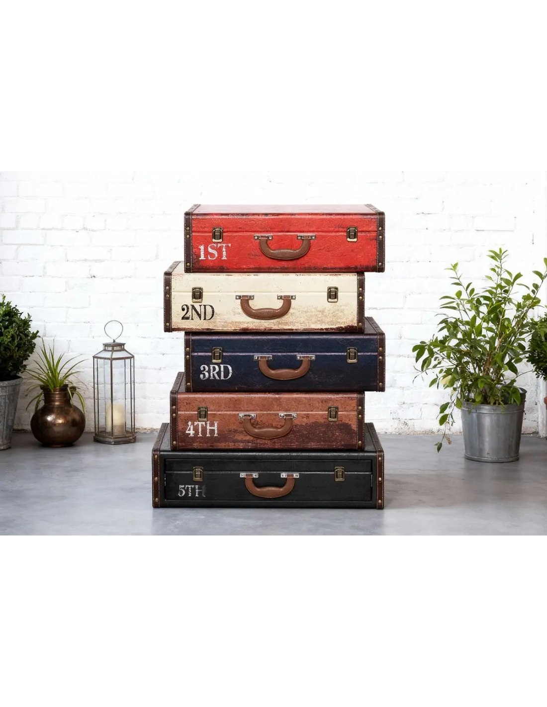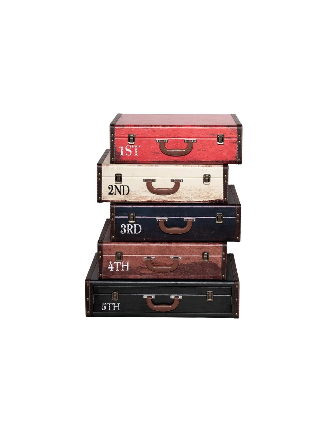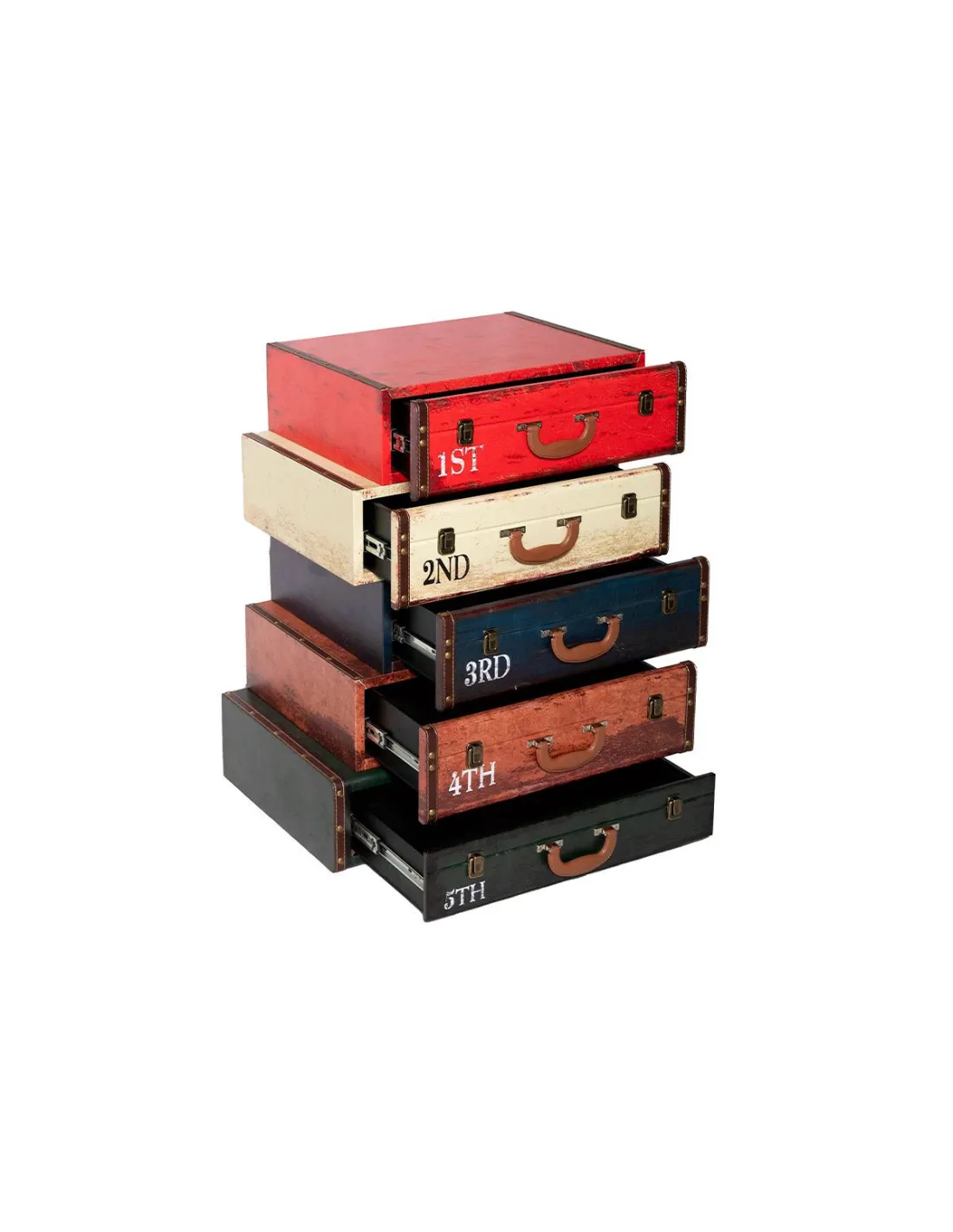• Chiffonnier 5 tiroirs façon valises• Look vintage, style voyage• Finition bois patiné effet cuir• Idéal en meuble d’entrée ou chambre