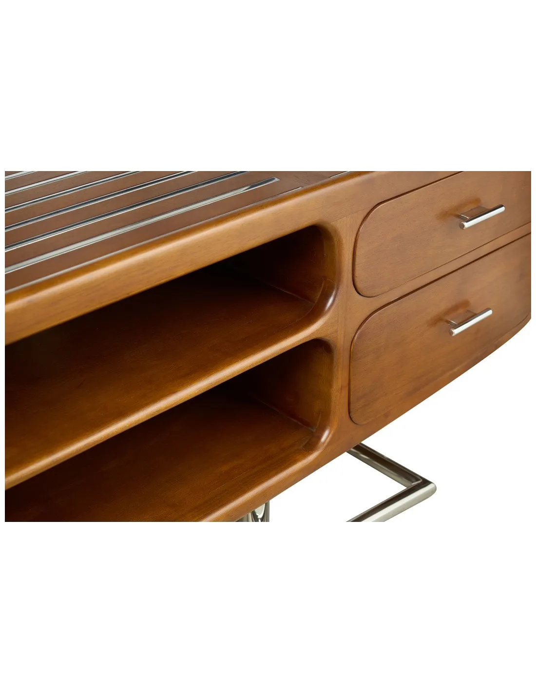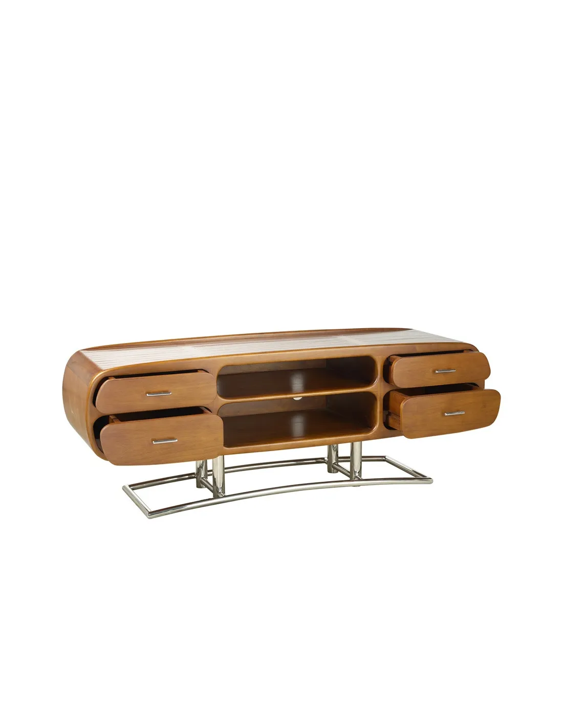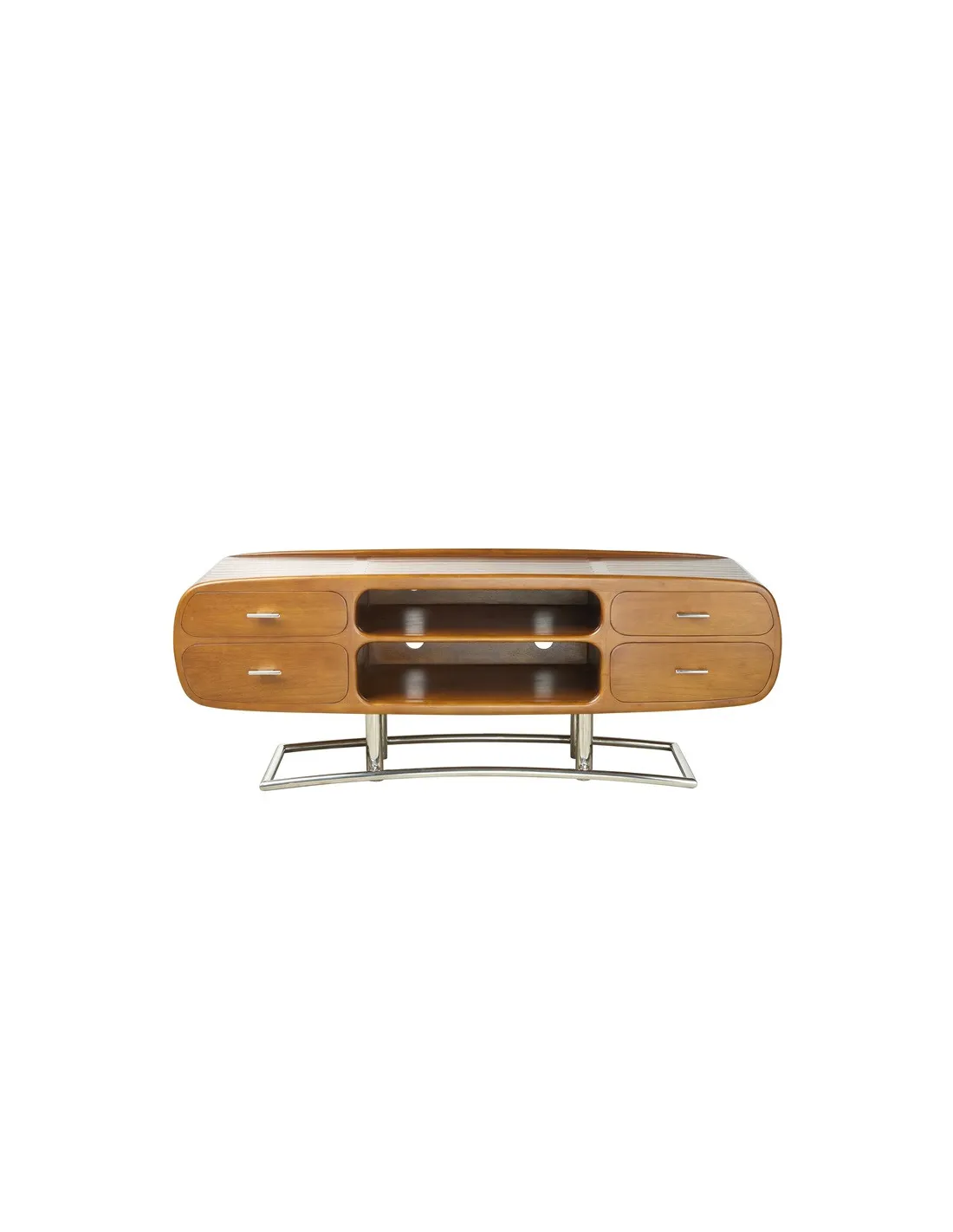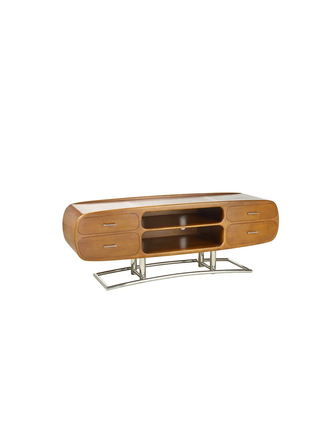 Meuble TV Marina, hévéa massif vernis, piètement et strie en inox, comprenant 4 tiroirs et 1 tablette.