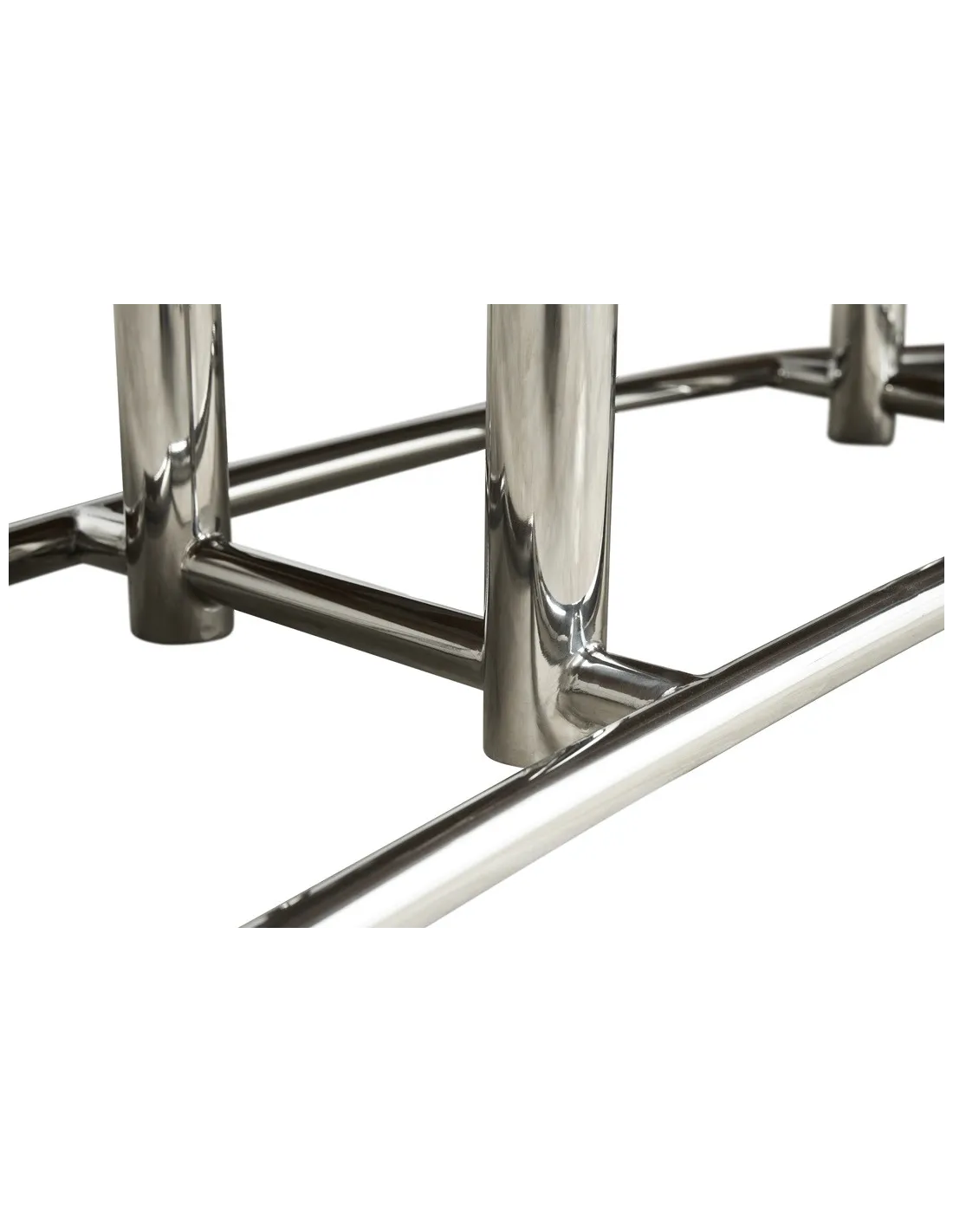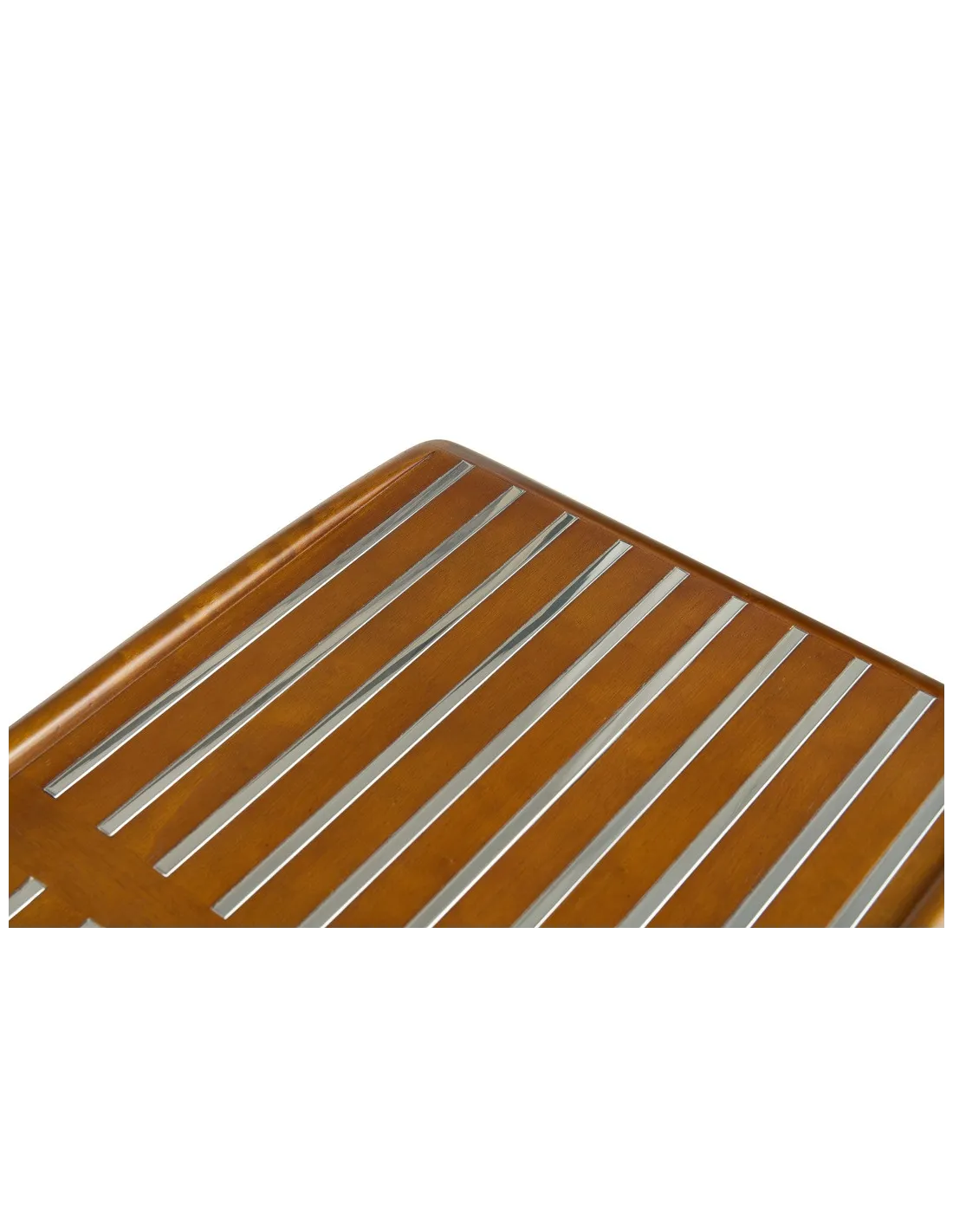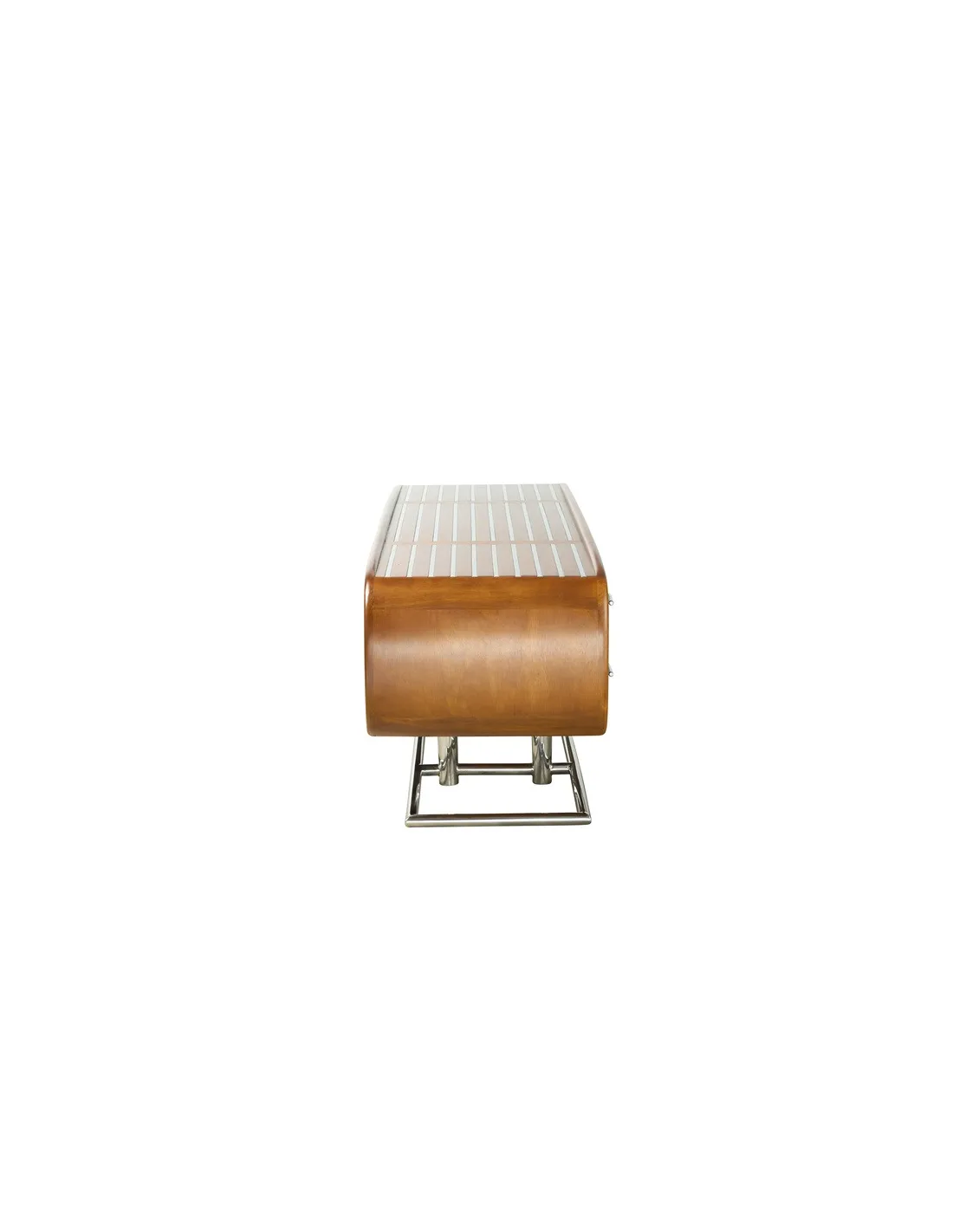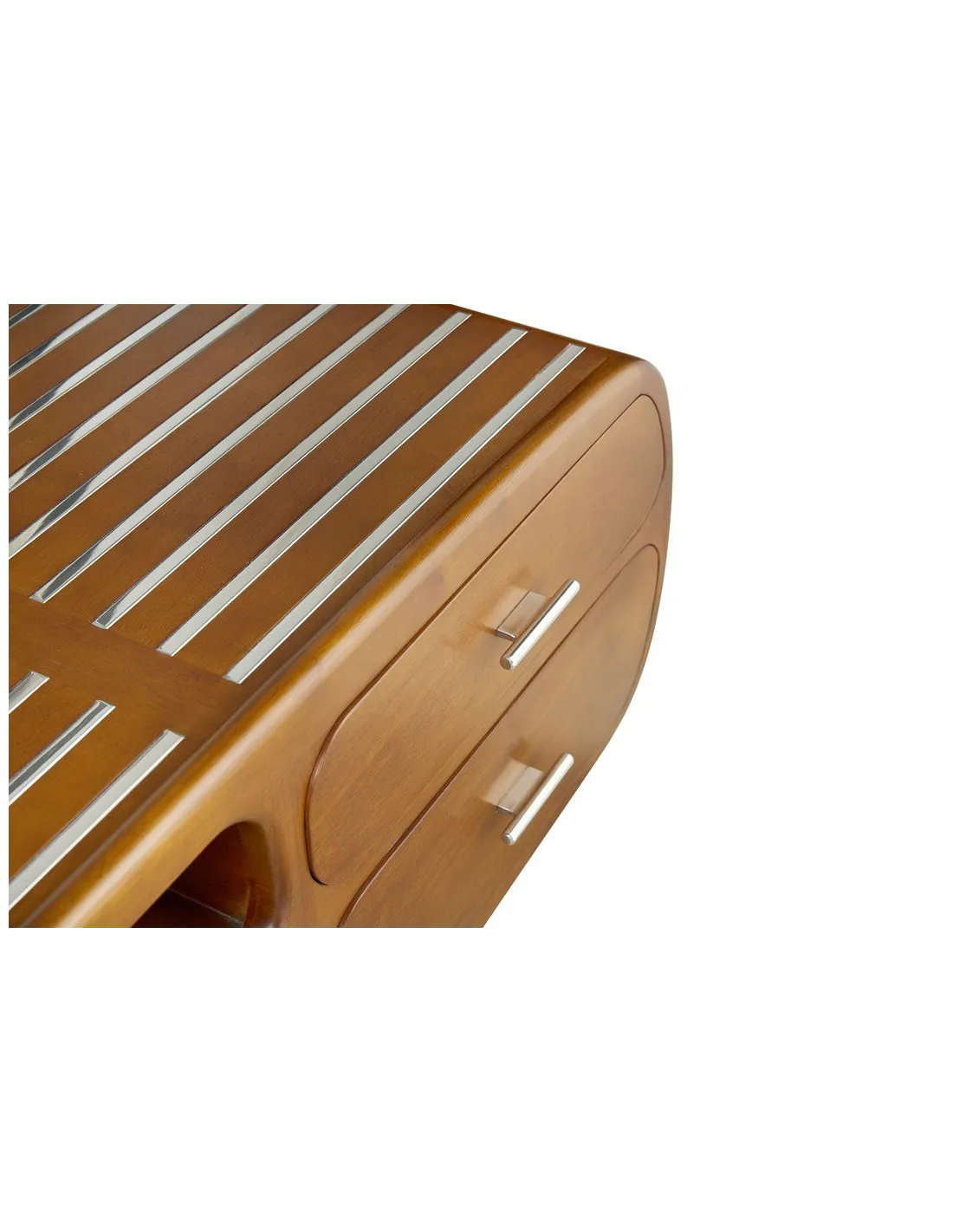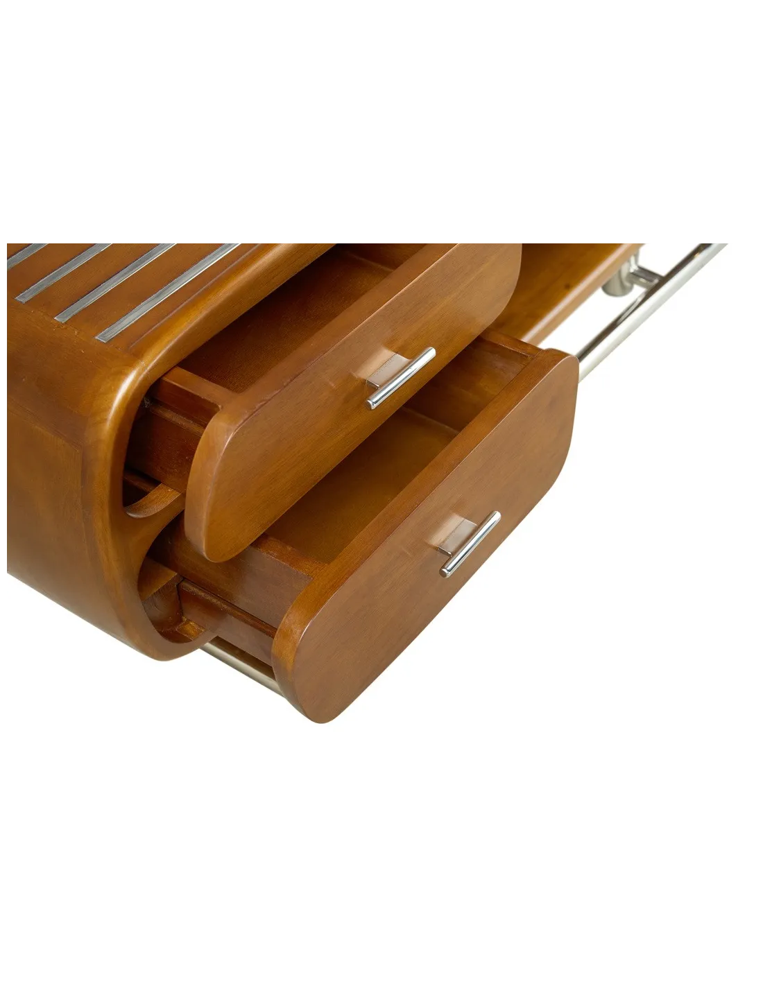 Meuble TV Marina, hévéa massif vernis, piètement et strie en inox, comprenant 4 tiroirs et 1 tablette.