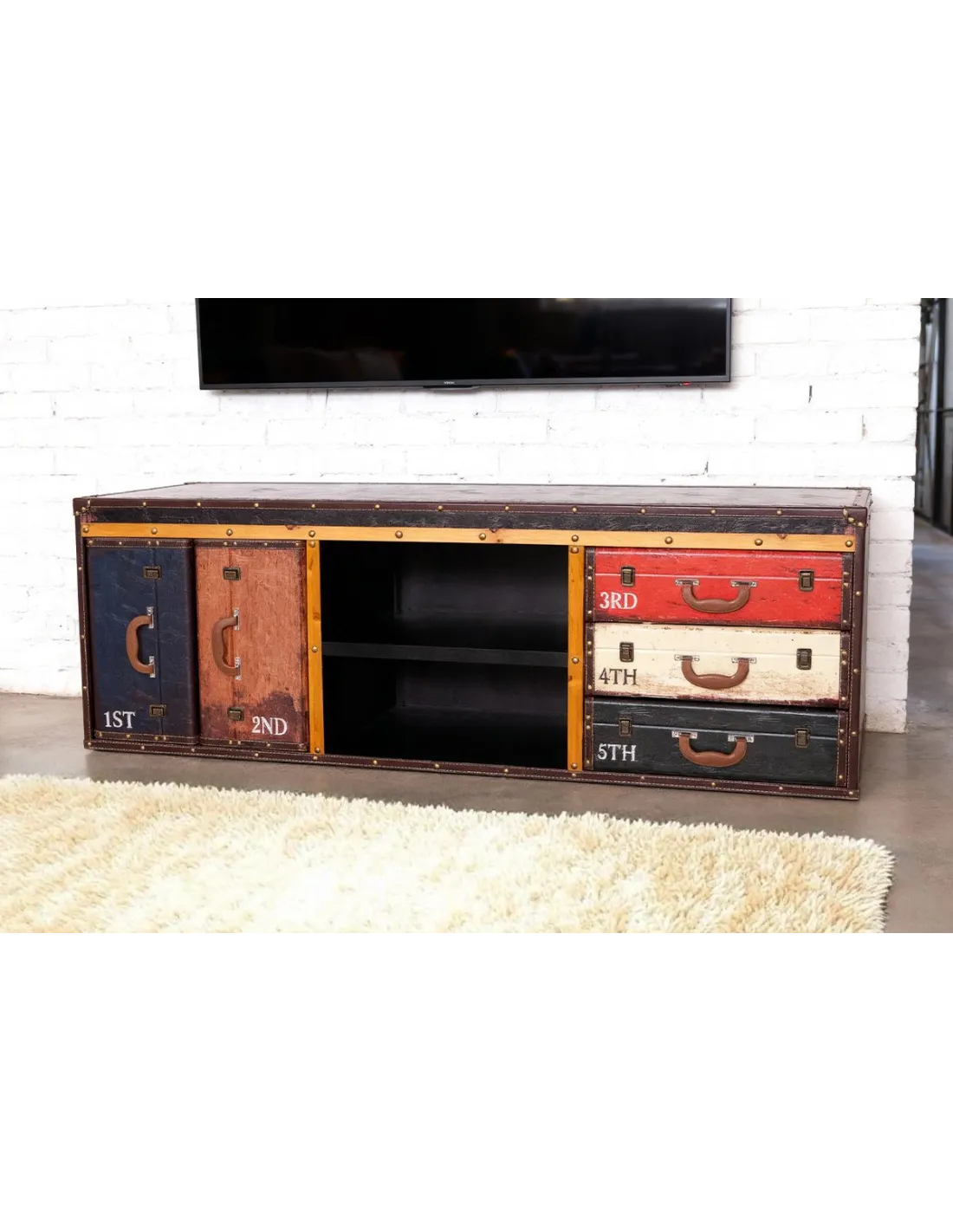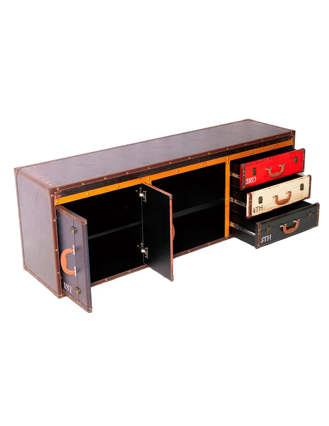 • Buffet 2 tiroirs et 2 portes façon valises.• Design vintage esprit voyage.• Finition bois patiné effet cuir.• Compact, idéal pour salle à manger ou salon.