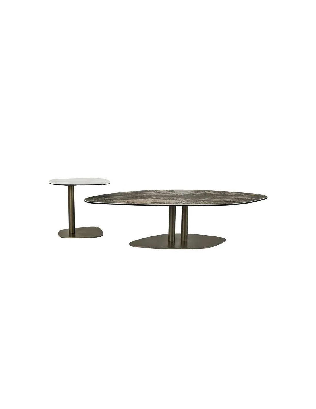 Table basse VELA : une table basse design au piétement bronze et au plateau en céramique effet marbre brun, pensée pour apporter caractère et élégance à un salon contemporain.