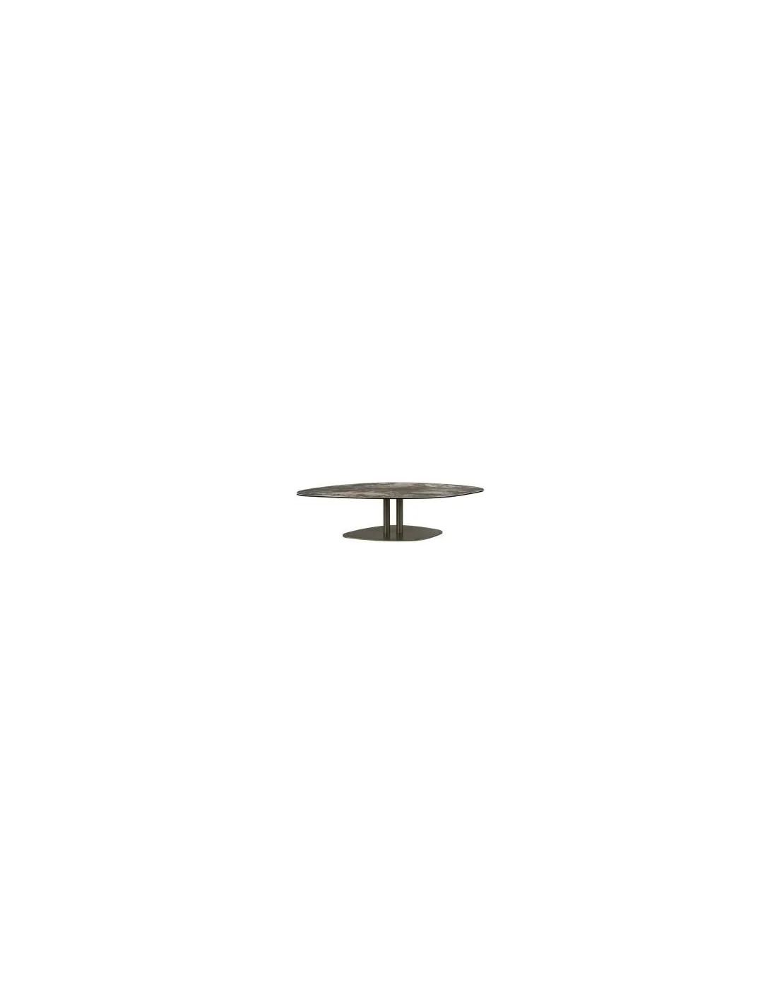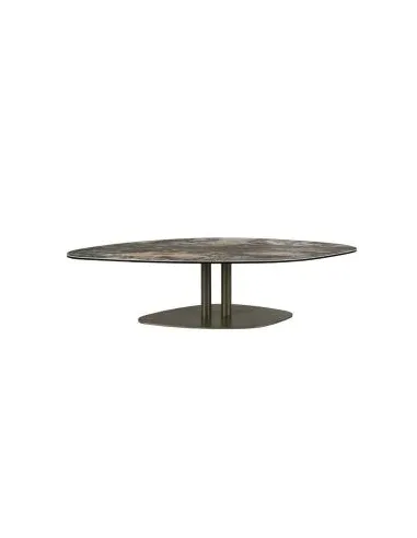 Table basse design bronze et céramique effet marbre brun. Lignes organiques et bords arrondis : une pièce forte pour un salon contemporain. Dimensions (L × P × H) : 139 × 73 × 36 cm.