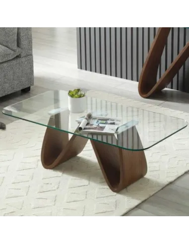 Courbes douces et matériaux chaleureux pour un salon contemporain. Bois plaqué noyer ou frêne et plateau en verre trempé (12 mm).