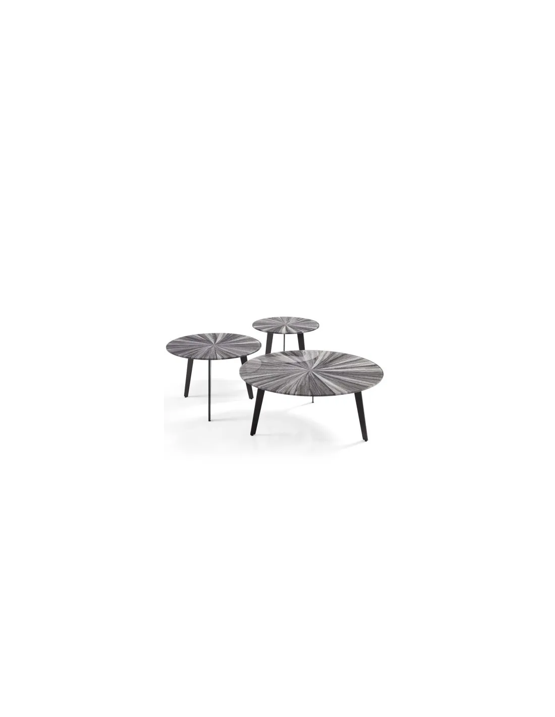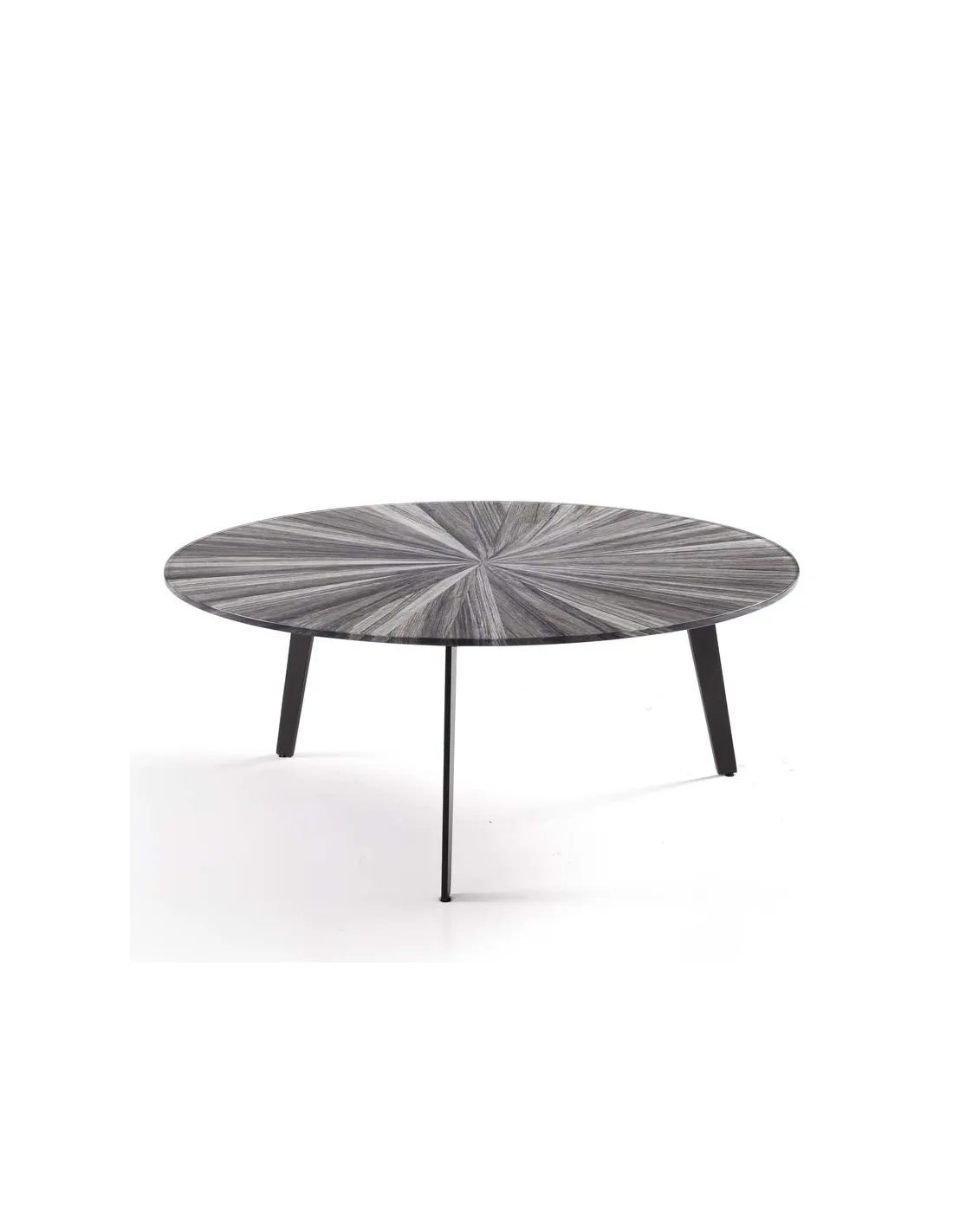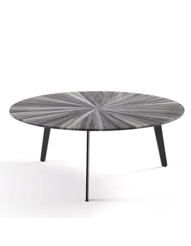 Grande table basse ronde : plateau verre sérigraphié effet bois grisé et piétement métal. Design organique et intemporel.