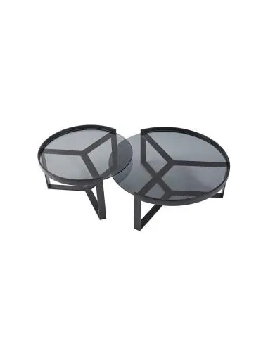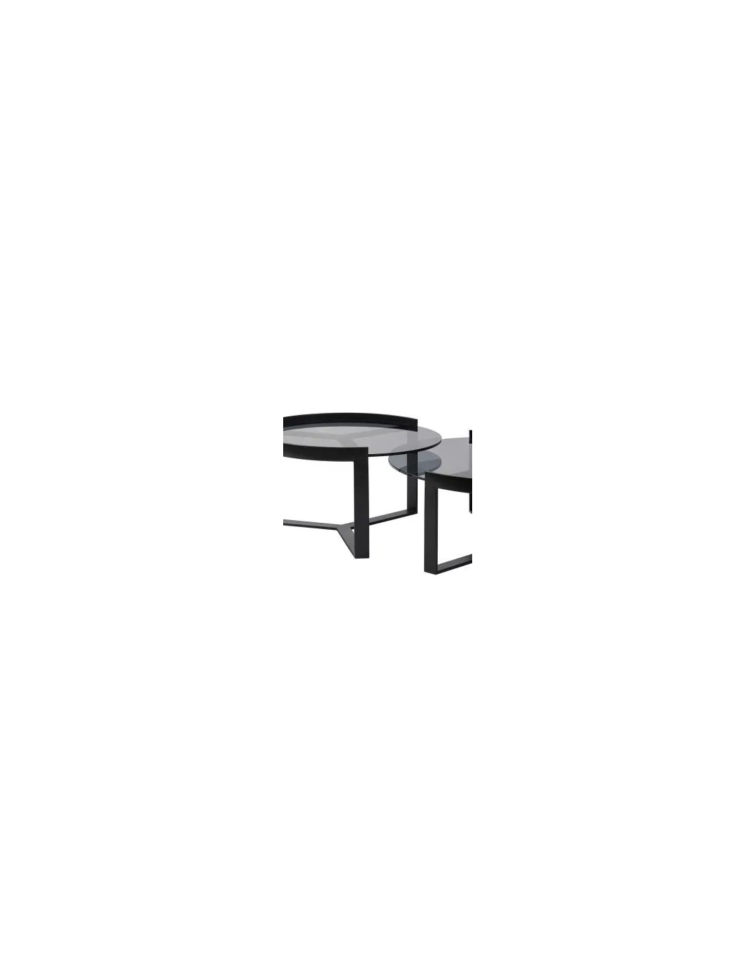 Deux tables gigognes au design sobre : structure métal noir et plateaux en verre fumé trempé.
