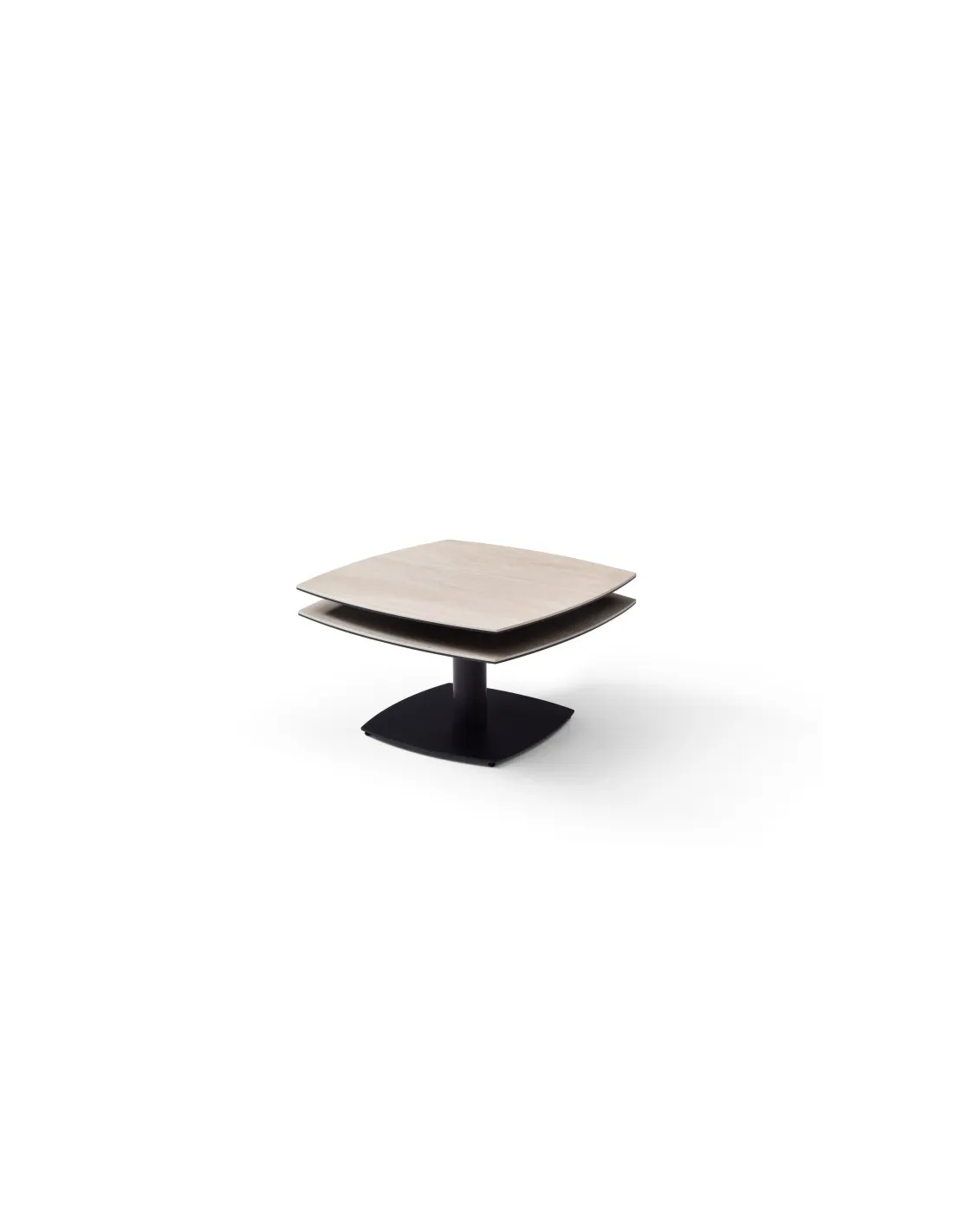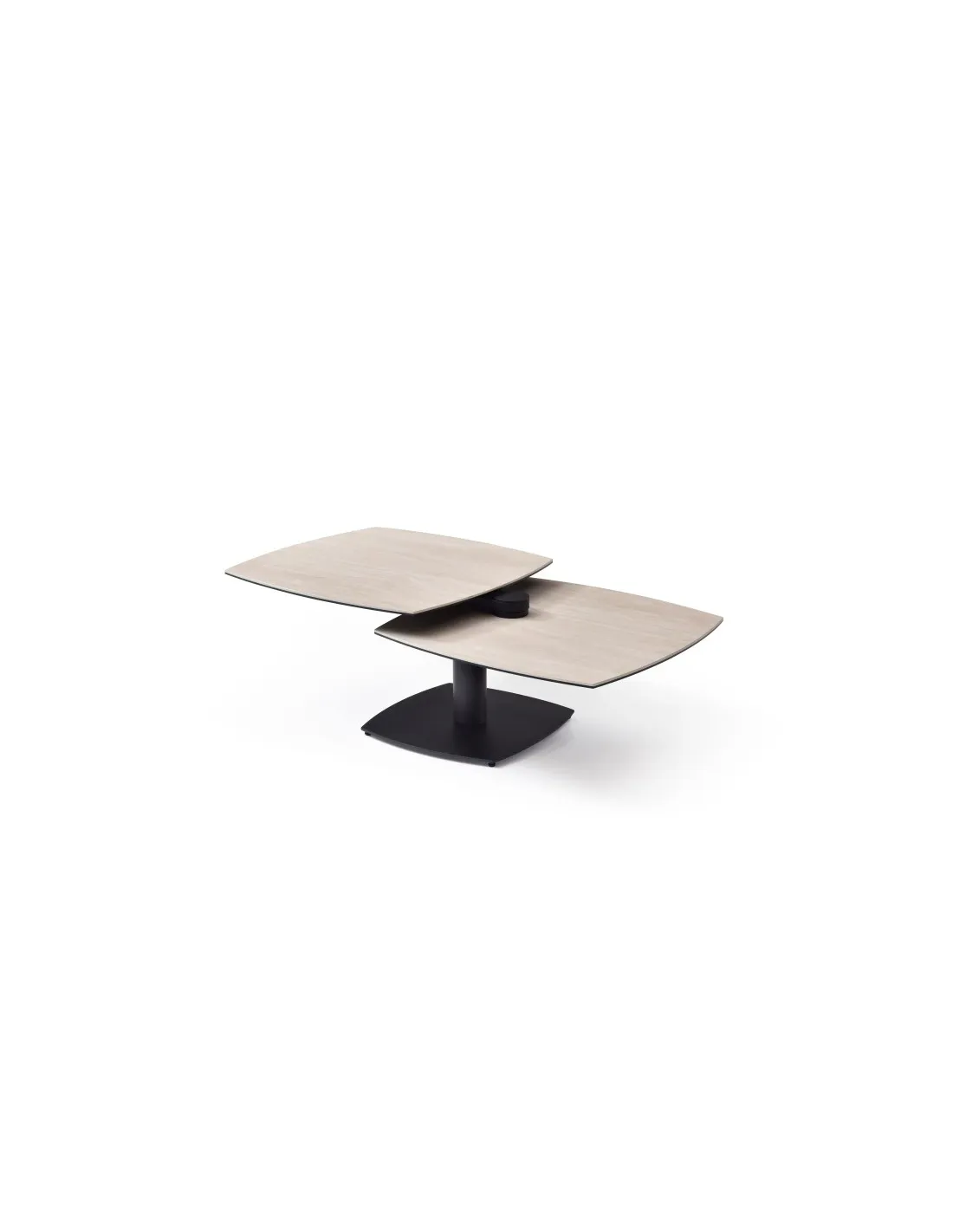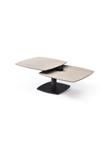Table basse modulable avec plateaux pivotants, idéale pour optimiser l’espace au quotidien. Métal noir et plateaux pivotants en céramique Travertin sur verre trempé.