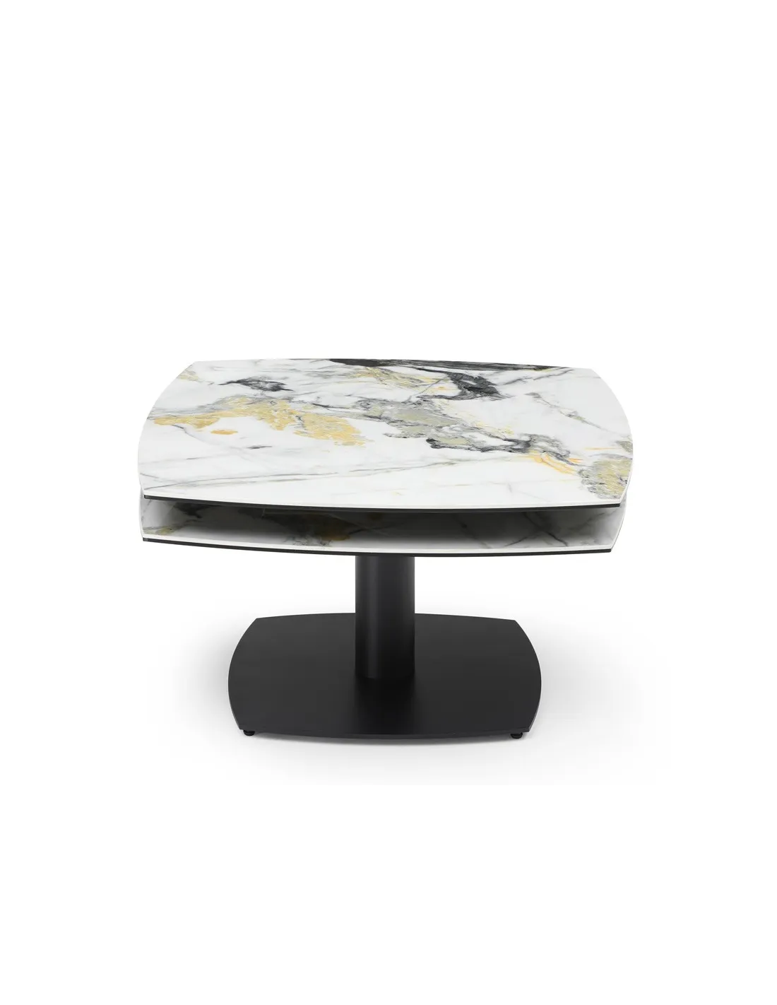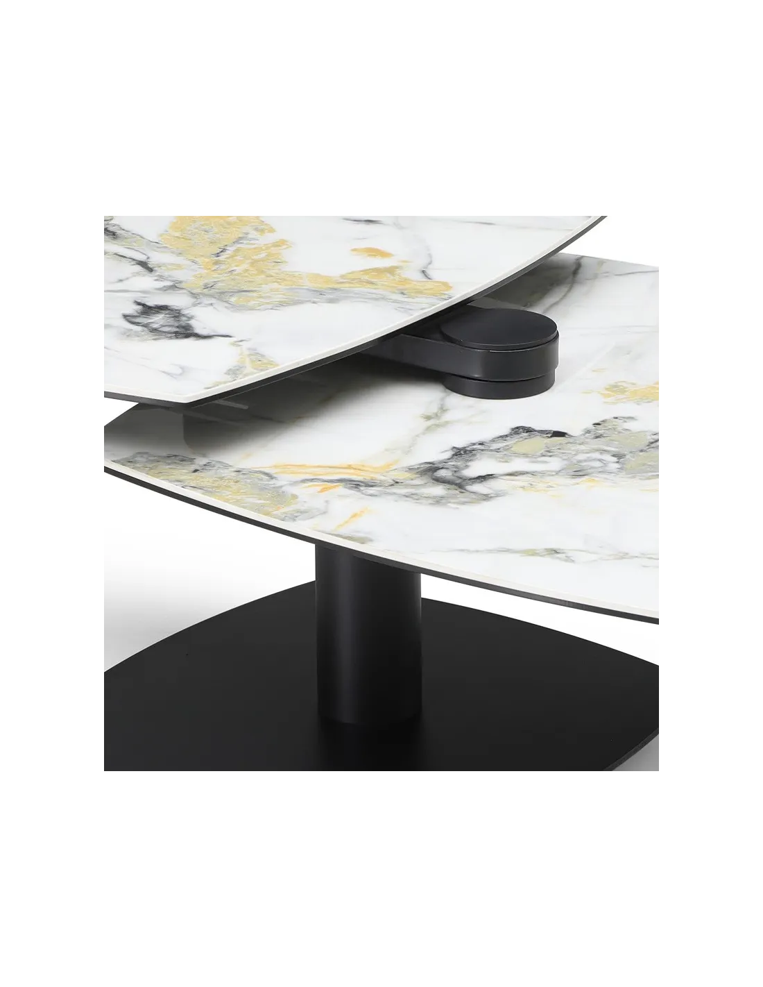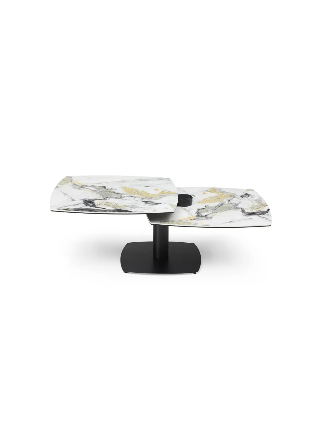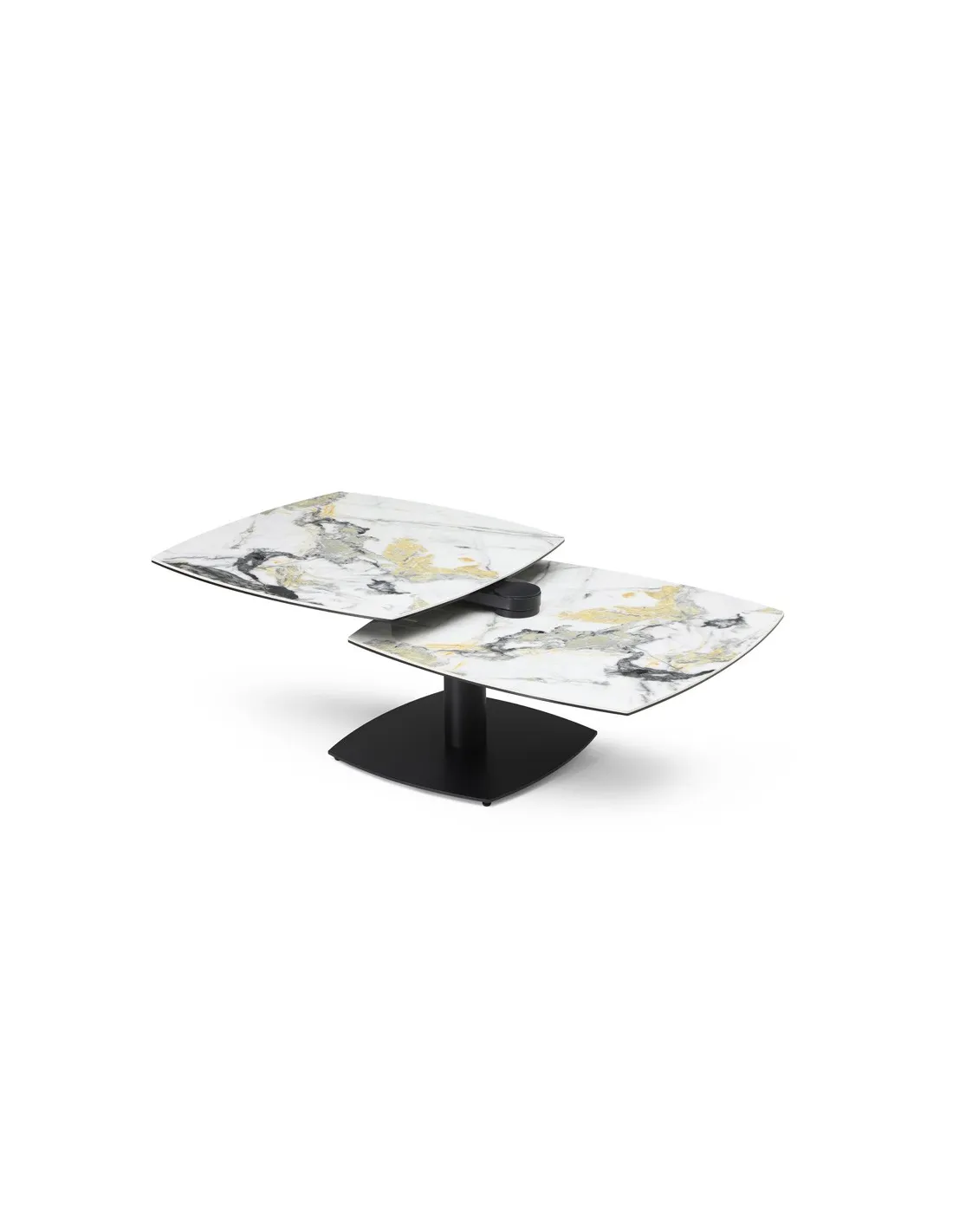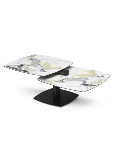 Table basse modulable avec plateaux pivotants, idéale pour optimiser l’espace au quotidien. Métal noir et plateaux pivotants en céramique Cold Jade sur verre trempé.