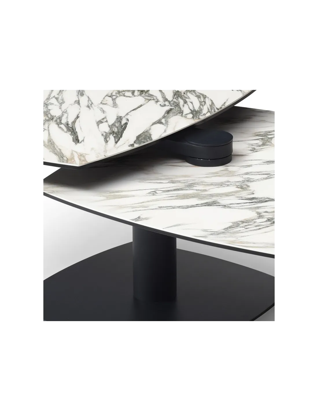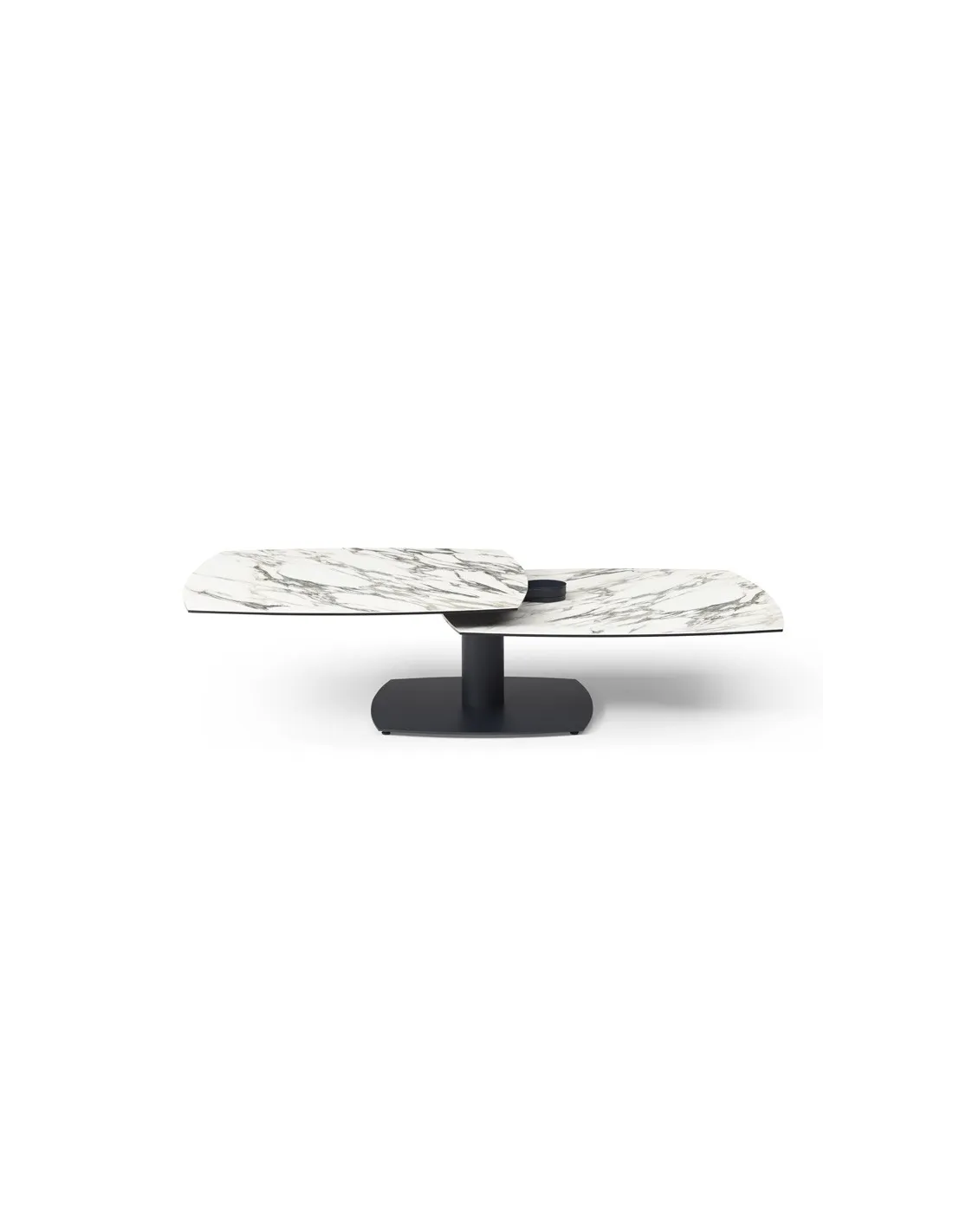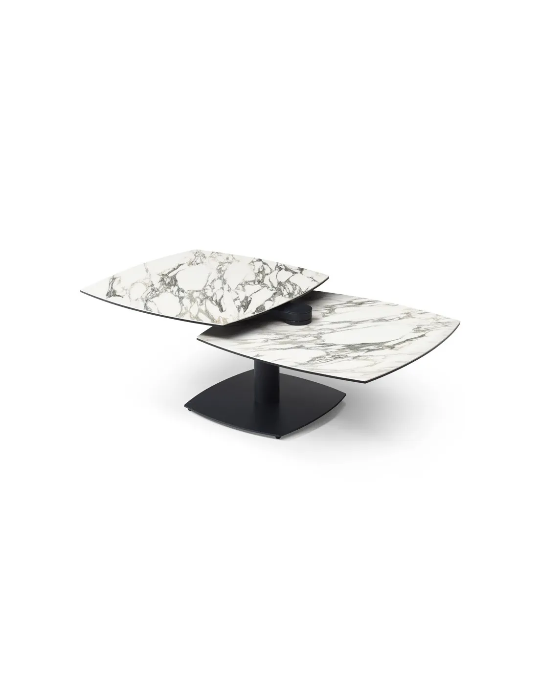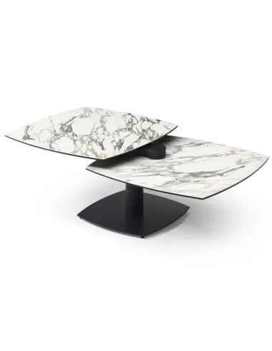Table basse modulable avec plateaux pivotants, idéale pour optimiser l’espace au quotidien. Métal noir et plateaux pivotants en céramique Kaledonia sur verre trempé.