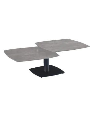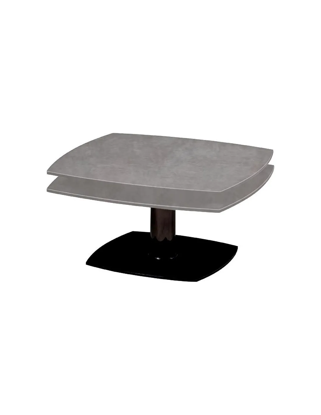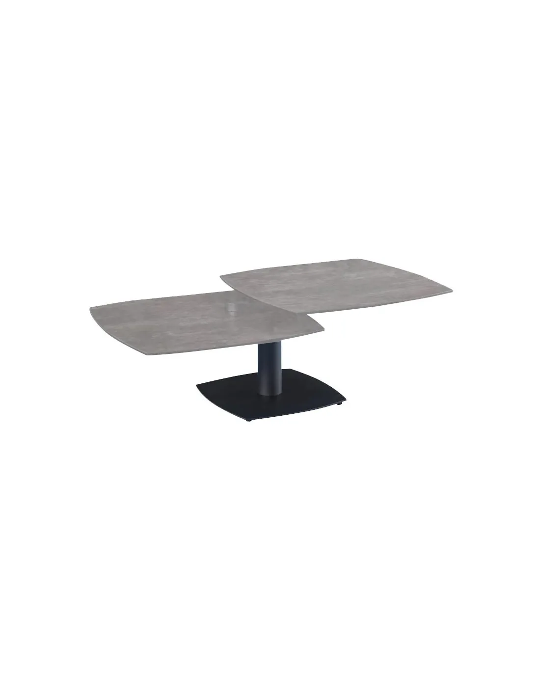 Table basse modulable avec plateaux pivotants, idéale pour optimiser l’espace au quotidien. Métal noir et plateaux pivotants en céramique Gris clair sur verre trempé.