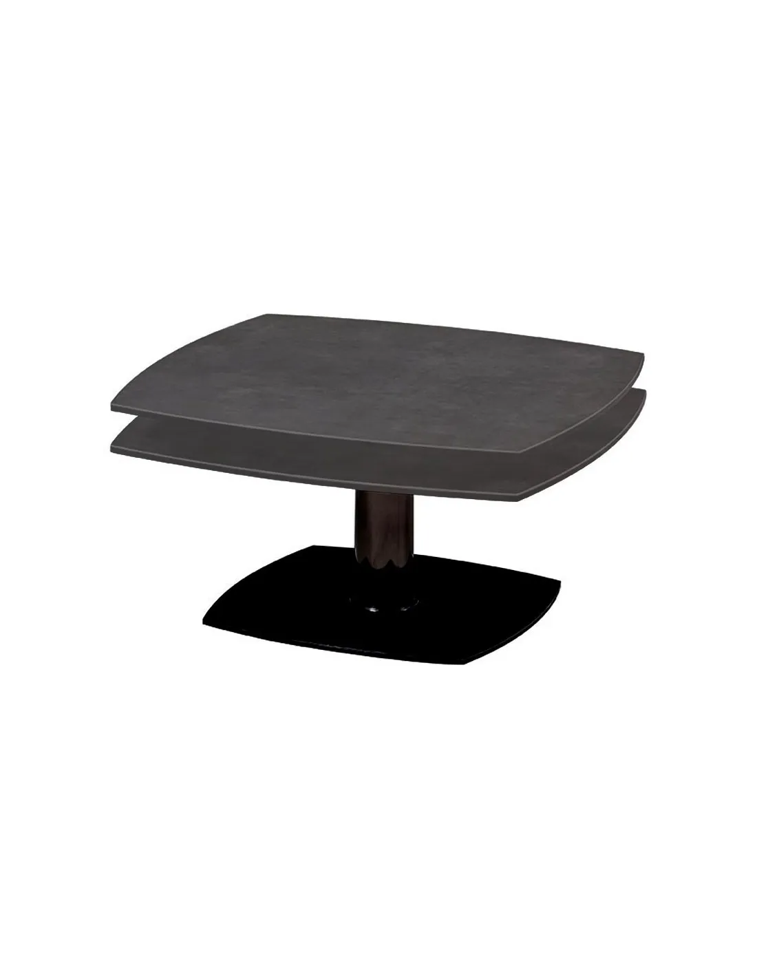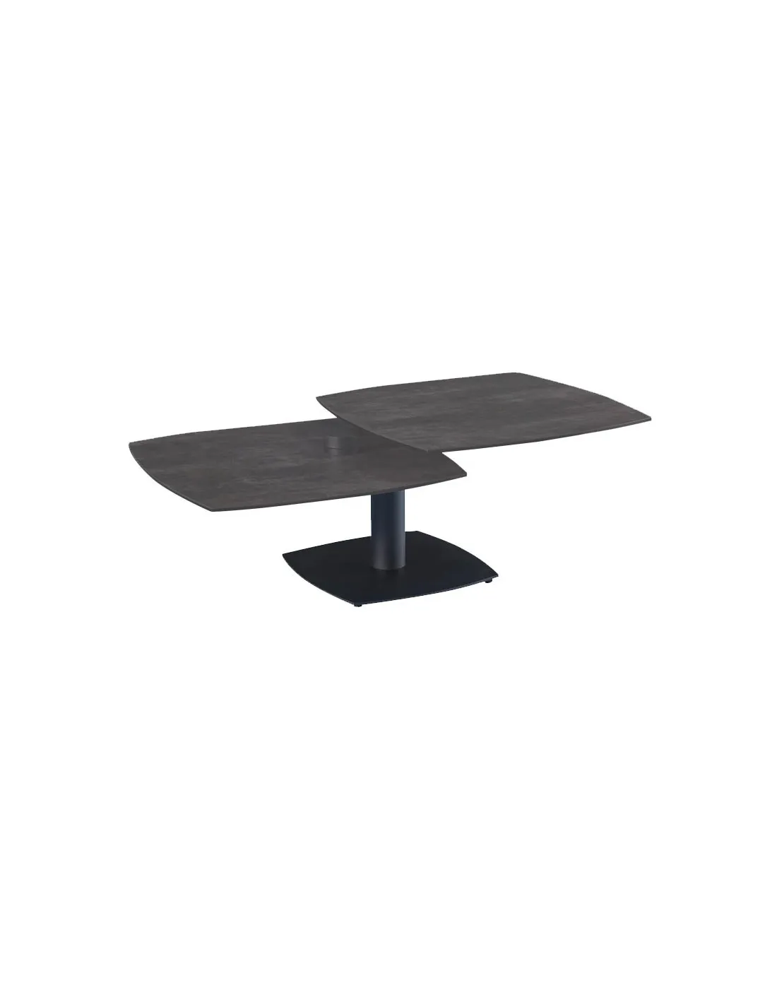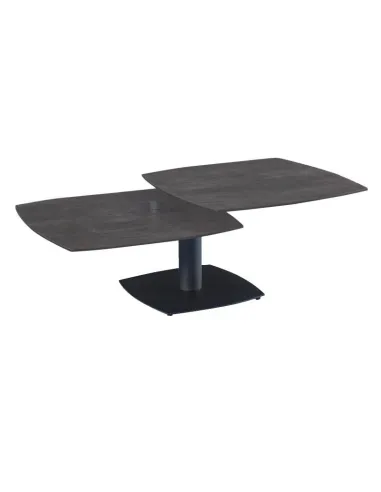 Table basse modulable avec plateaux pivotants, idéale pour optimiser l’espace au quotidien. Métal noir et plateaux pivotants en céramique Corten sur verre trempé.