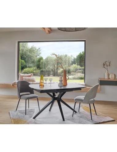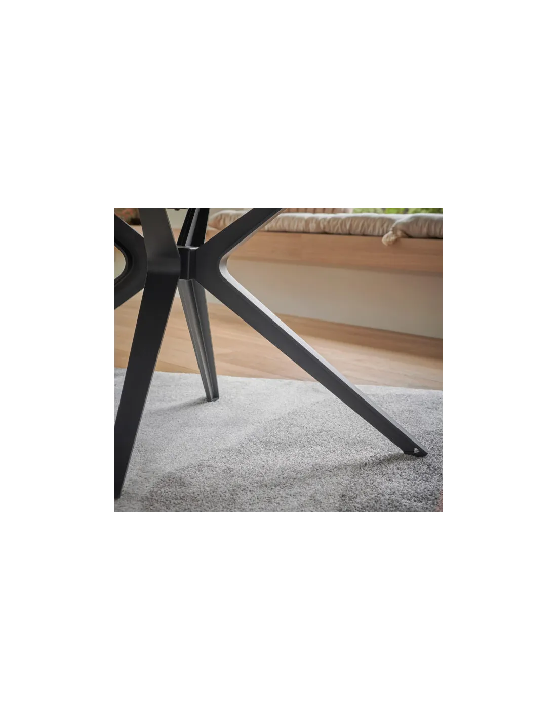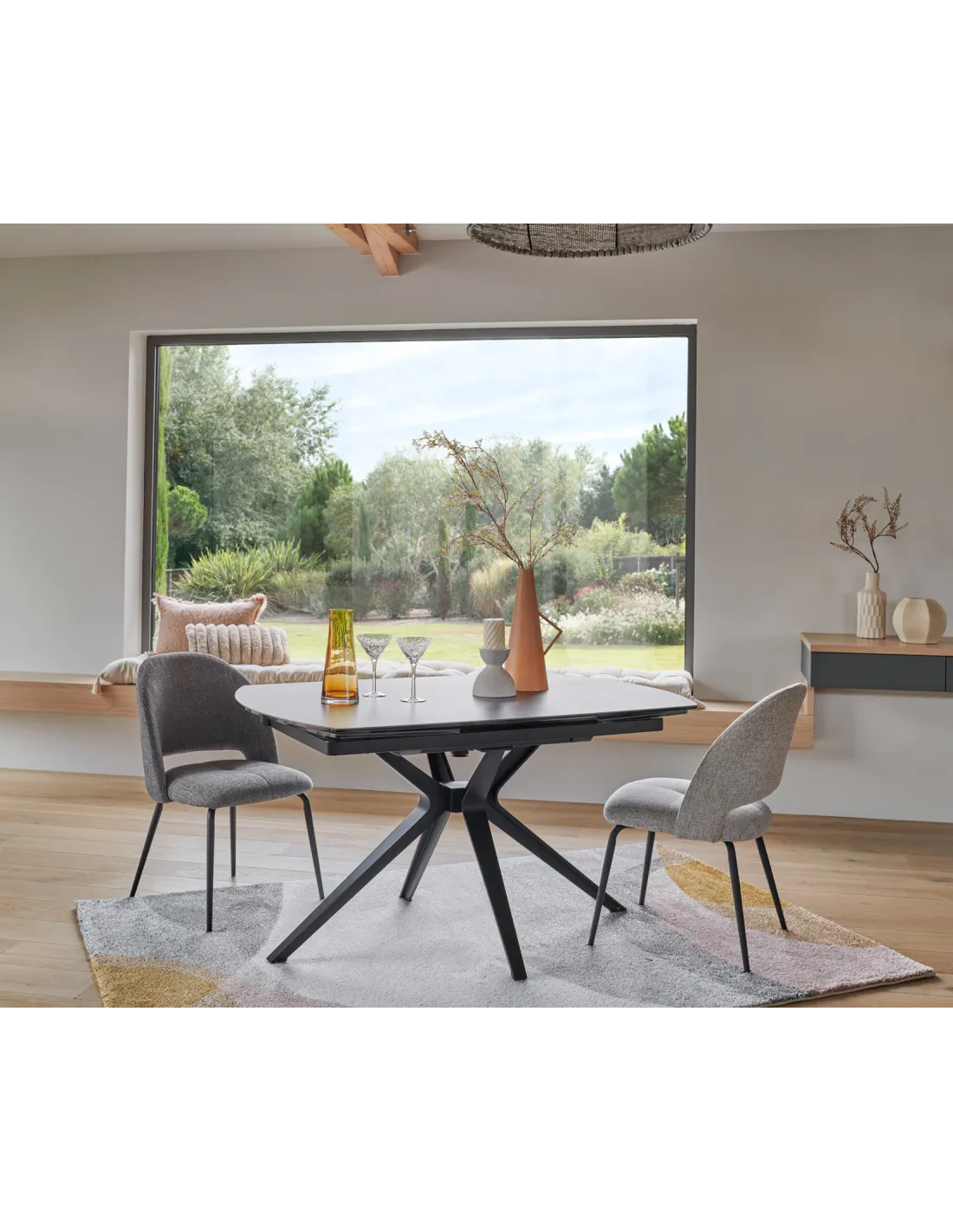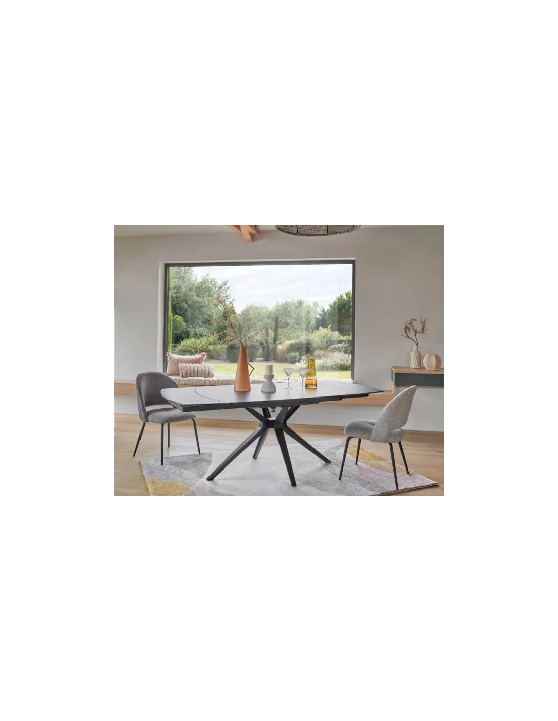 Découvrez cette table de 140 cm en céramique montée sur verre, équipée de deux rallonges de 30 cm chacune, offrant une longueur totale de 200 cm.