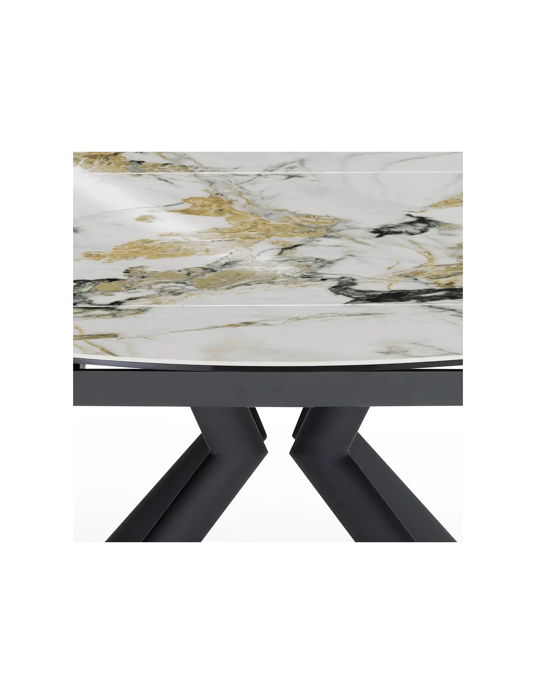 Découvrez la Table repas SOFIA ronde avec son plateau céramique veiné cold jade, son piétement anguleux et la cinématique si particulière de son plateau qui transforme en un mouvement de main votre table rectangulaire en une table repas ronde.