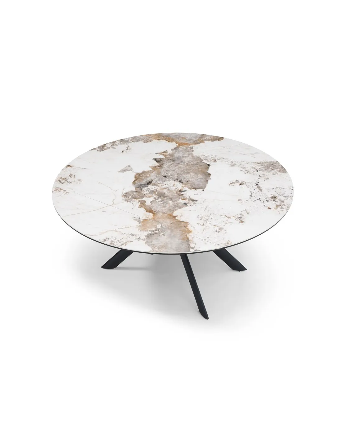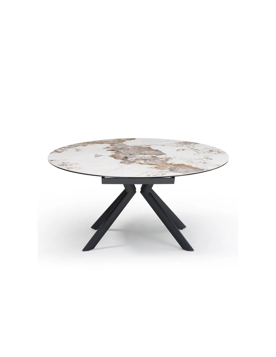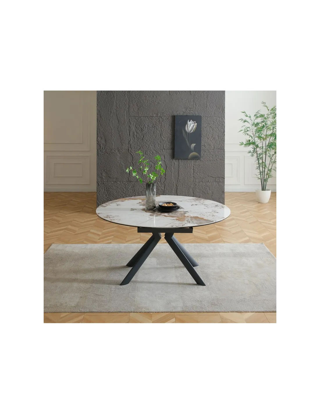 Table Sofia en céramique Pandora à rallonges, passe de rectangle à ronde.