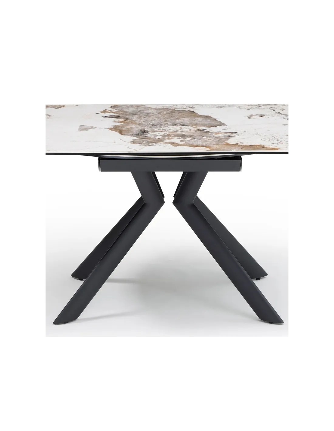 Découvrez la Table repas SOFIA ronde avec son plateau céramique Pandora, son piétement anguleux et la cinématique si particulière de son plateau qui transforme en un mouvement de main votre table rectangulaire en une table repas ronde.