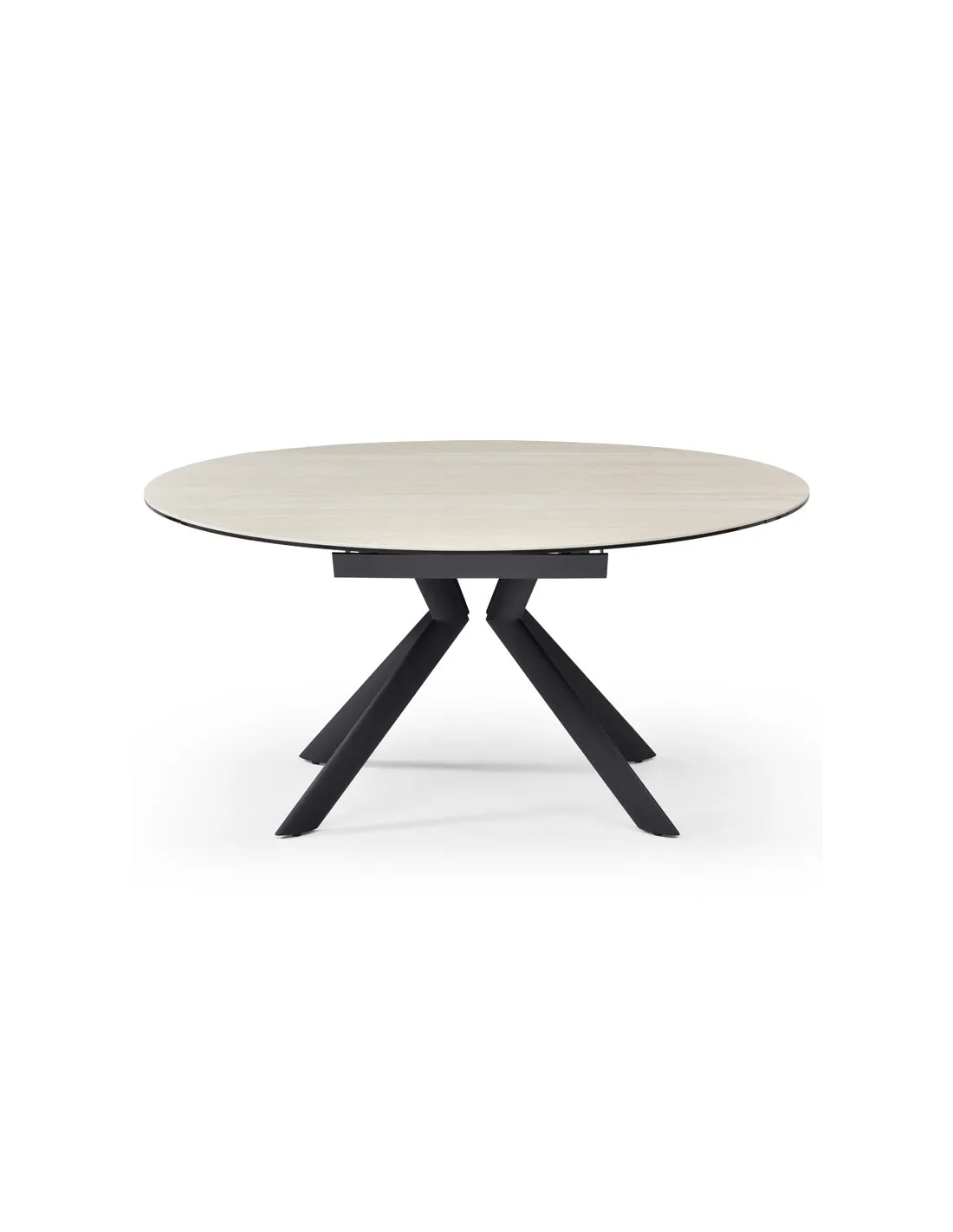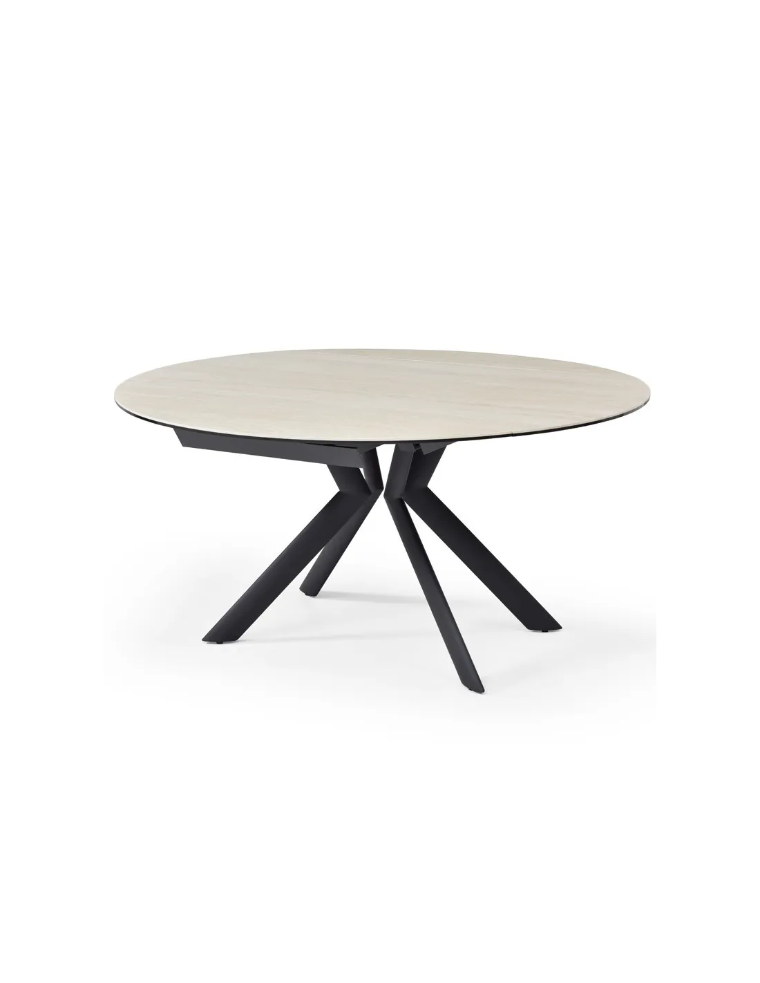 Table Natalia en céramique golden stone à rallonges, passe de ronde à ovale.