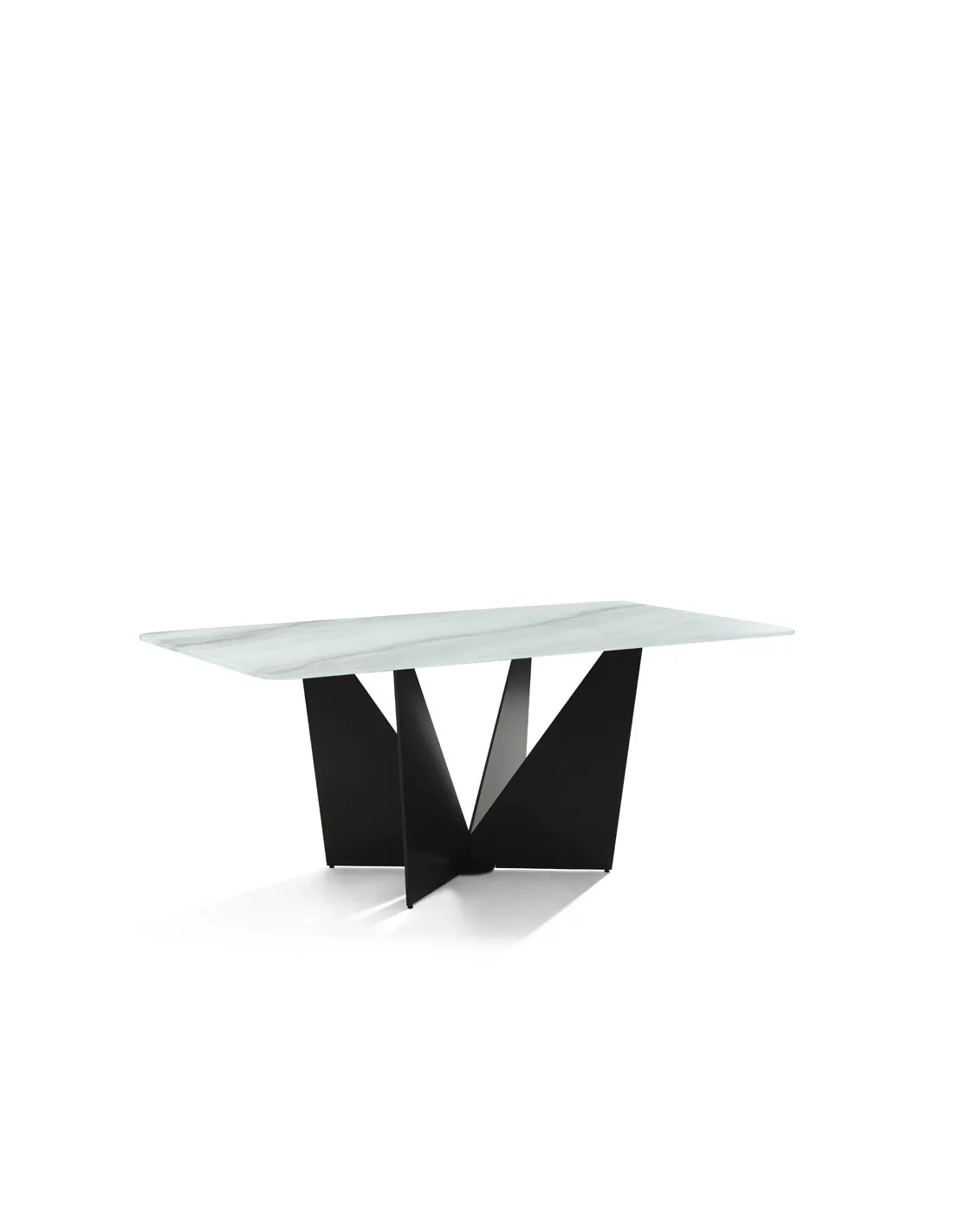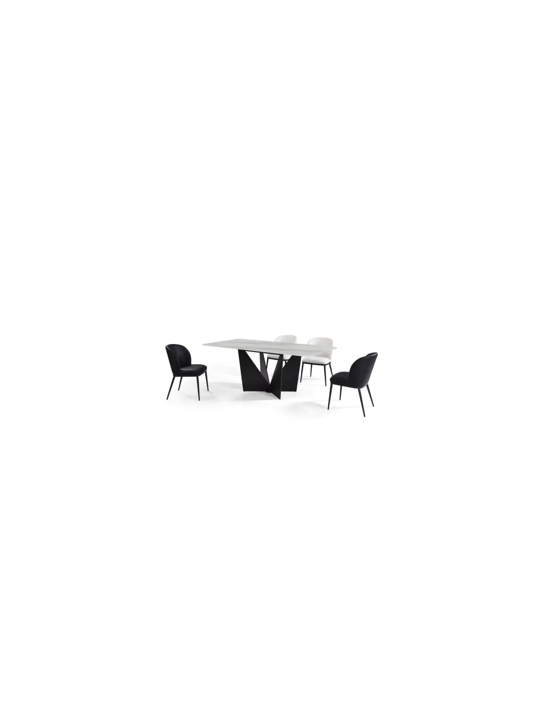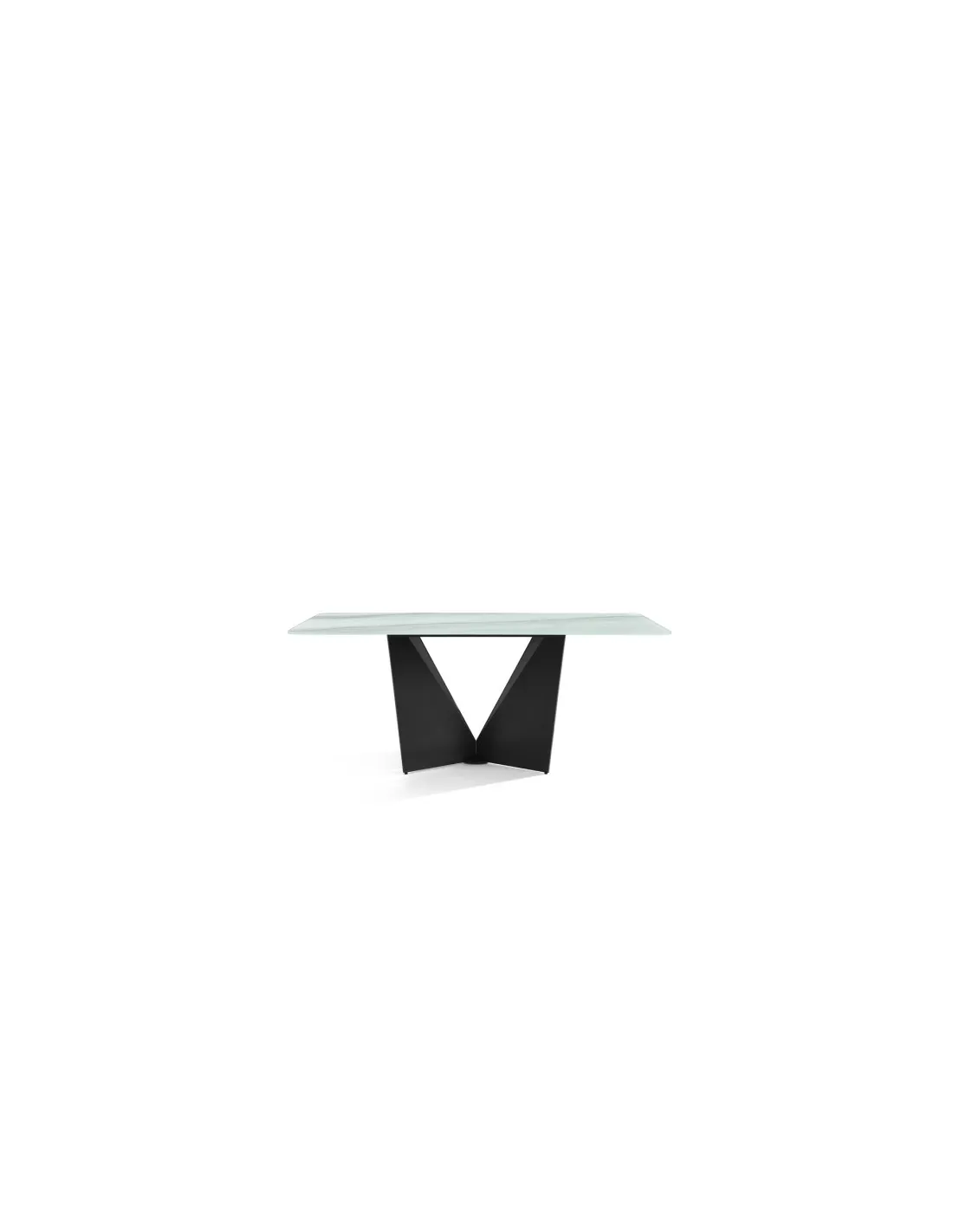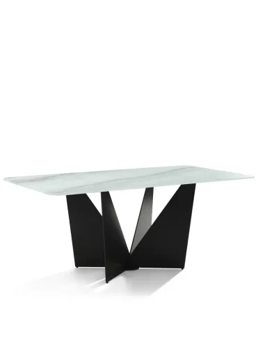 La table repas ALEXIA combine élégance minérale et lignes graphiques. Son plateau rectangulaire en verre trempé effet marbre (jade blanc) s’équilibre sur un piétement central métallique au style architectural.