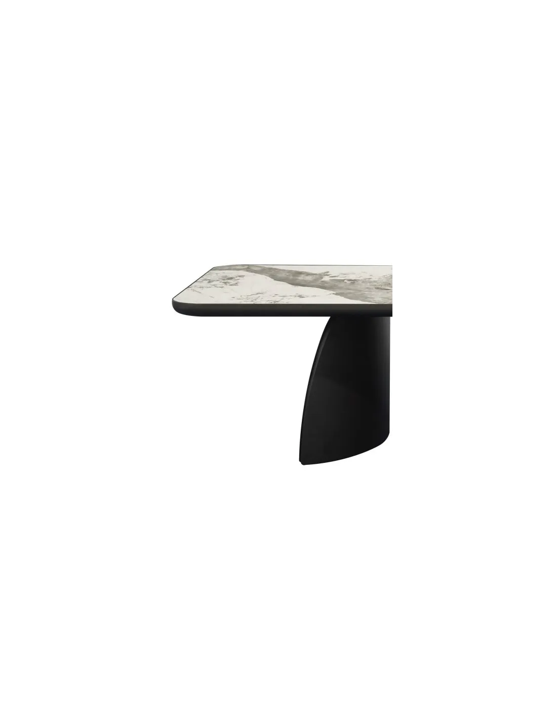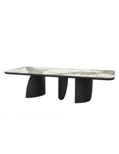 La table repas JOHANA affirme un style contemporain premium : un grand plateau rectangulaire en céramique Pandora marbrée porté par trois pieds massifs aux formes douces. Une pièce maîtresse pour sublimer une salle à manger moderne.