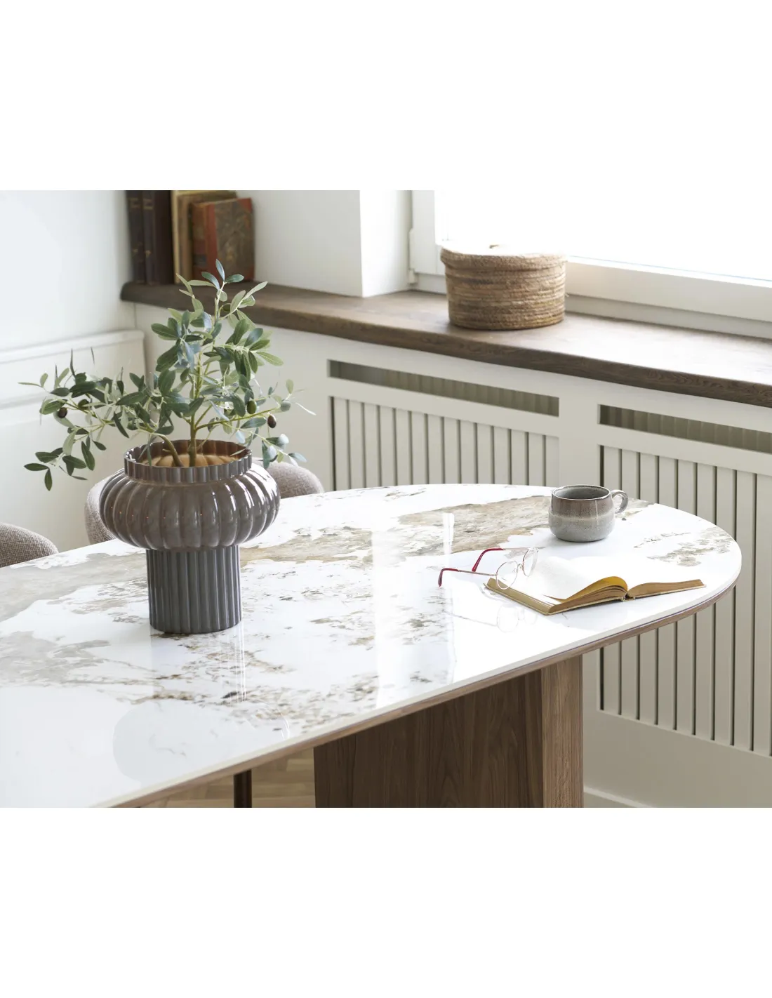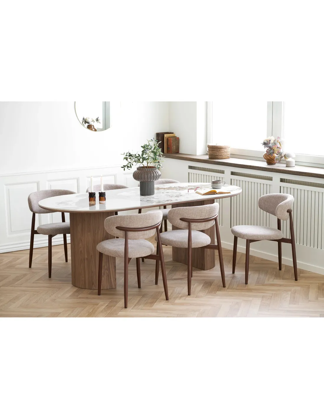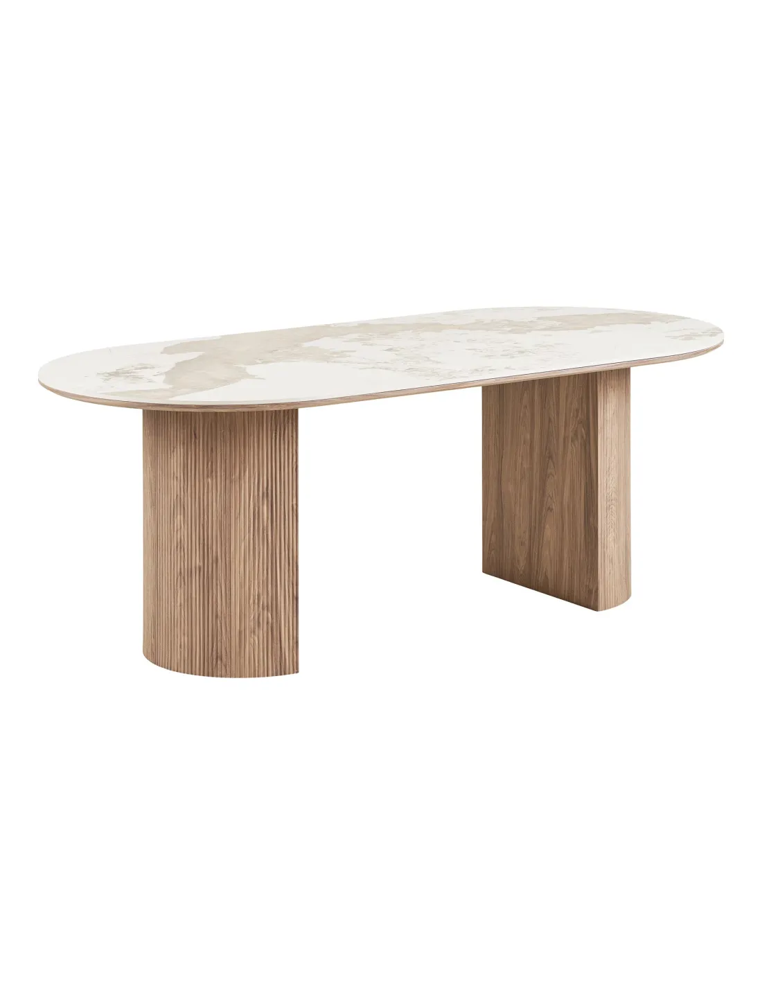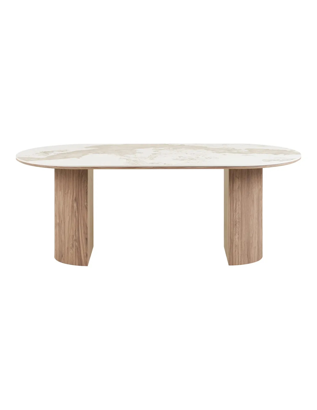 La table de salle à manger Athènes combine design et robustesse. Son plateau en céramique blanc et ses pieds effet bois apportent élégance et praticité. Parfait pour vos repas.
