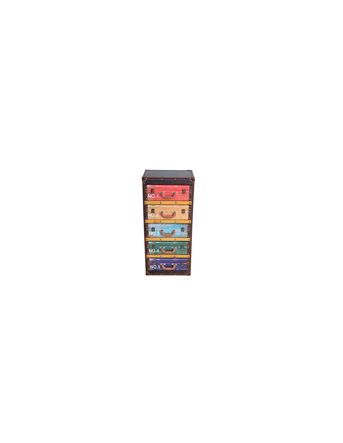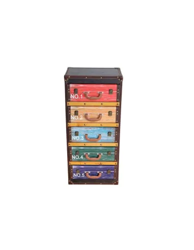 Ses 5 tiroirs décorés comme de véritables valises empilées évoquent les malles d’aventuriers d’autrefois, avec des couleurs douces et patinées.