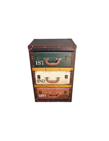 Ses 3 tiroirs évoquent des bagages anciens avec des finitions travaillées façon cuir vieilli et des poignées rivetées.